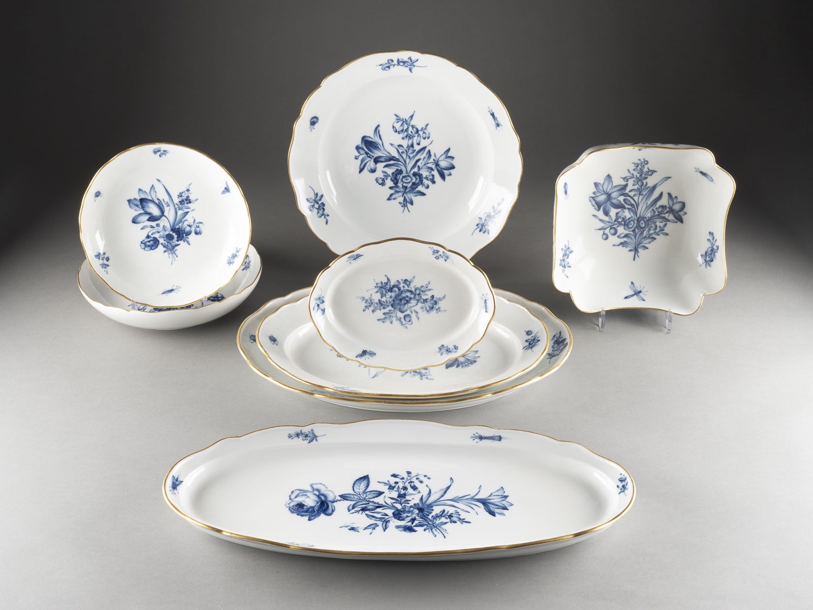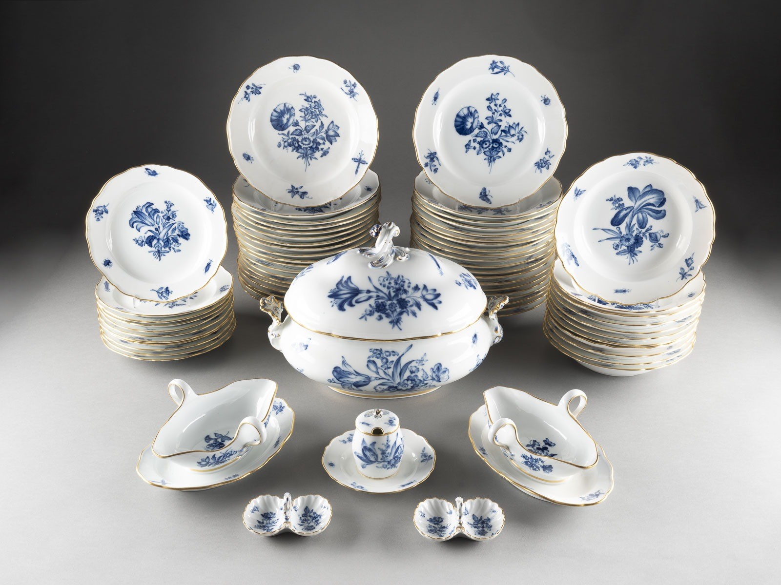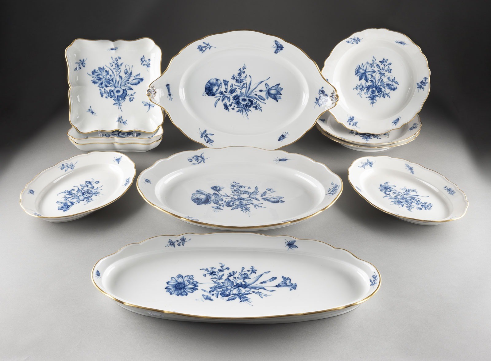 Porzellan, Blaumalerei, Goldstaffage. H. bis 26 cm (Terrine), L. bis 60,5 cm (große Fisc. Unterglasurblaue Knaufschwerter, Press- und Malernummer, part. Beizeichen. Form: Neuer Ausschnitt. 1 Terrine, 2 Saucieren, 39 Speiseteller, 11 Vorspeiseteller, 11
