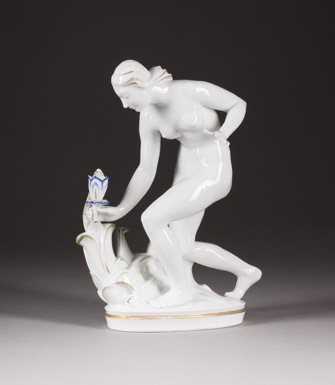 Weißporzellan, dezente polychrome Malerei und Goldstaffage. H. 34 cm. Blaue ENS-Windmühlenmarke, Modellnr. '5194 2'. Bez. 'A. W. Goebel Düsseldorf'. Part. min. rest.