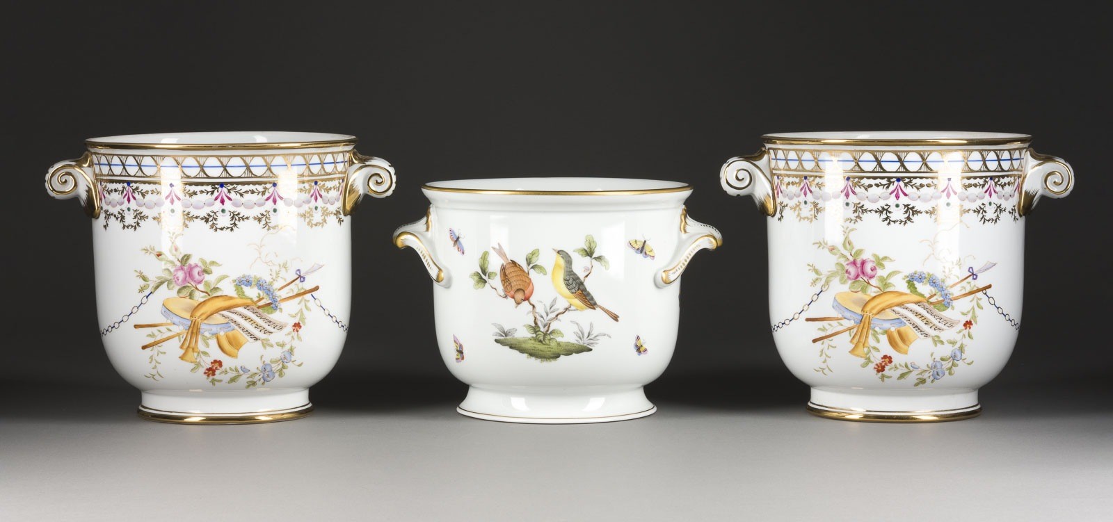 Porzellan, polychrom Malerei, Goldstaffage. H. 16,5 bis 20 cm. Teilw. aufglasurblauer Manufakturstempel, Dekorzeichen, Maler- und Modellnr. Teilw. unmarkiert. Wohl fehlend zwei Deckel.