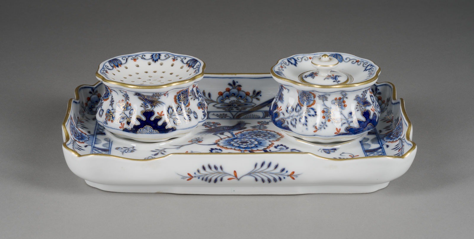 Porzellan, Blaumalerei, roter Aufglasurdekor, Goldstaffage. 26x17,5 cm (Tablett), H. 6,5 cm (Tintenfass). Blaue Knaufschwerter, Pressnummer, einmal Malernummer, Modellnummer 'Y 38a'. 1 Tablett, 1 Tintenfass, 1 Sandstreuer. 1. Wahl. Gold part. ber.