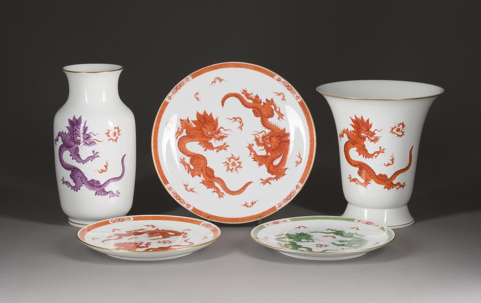 Porzellan, Camaieumalerei in Rot, Grün und Violett, Goldstaffage. H. 25,5-30 cm (Vasen), D. 25,5-30,5 cm (Teller). Unterglasurblaue Schwertermarke, Press- und Malernummer, part. Jahreszeichen, Modellnr. Bestehend aus: 2 Vasen, 3 Tellern. 2./4. Wahl.