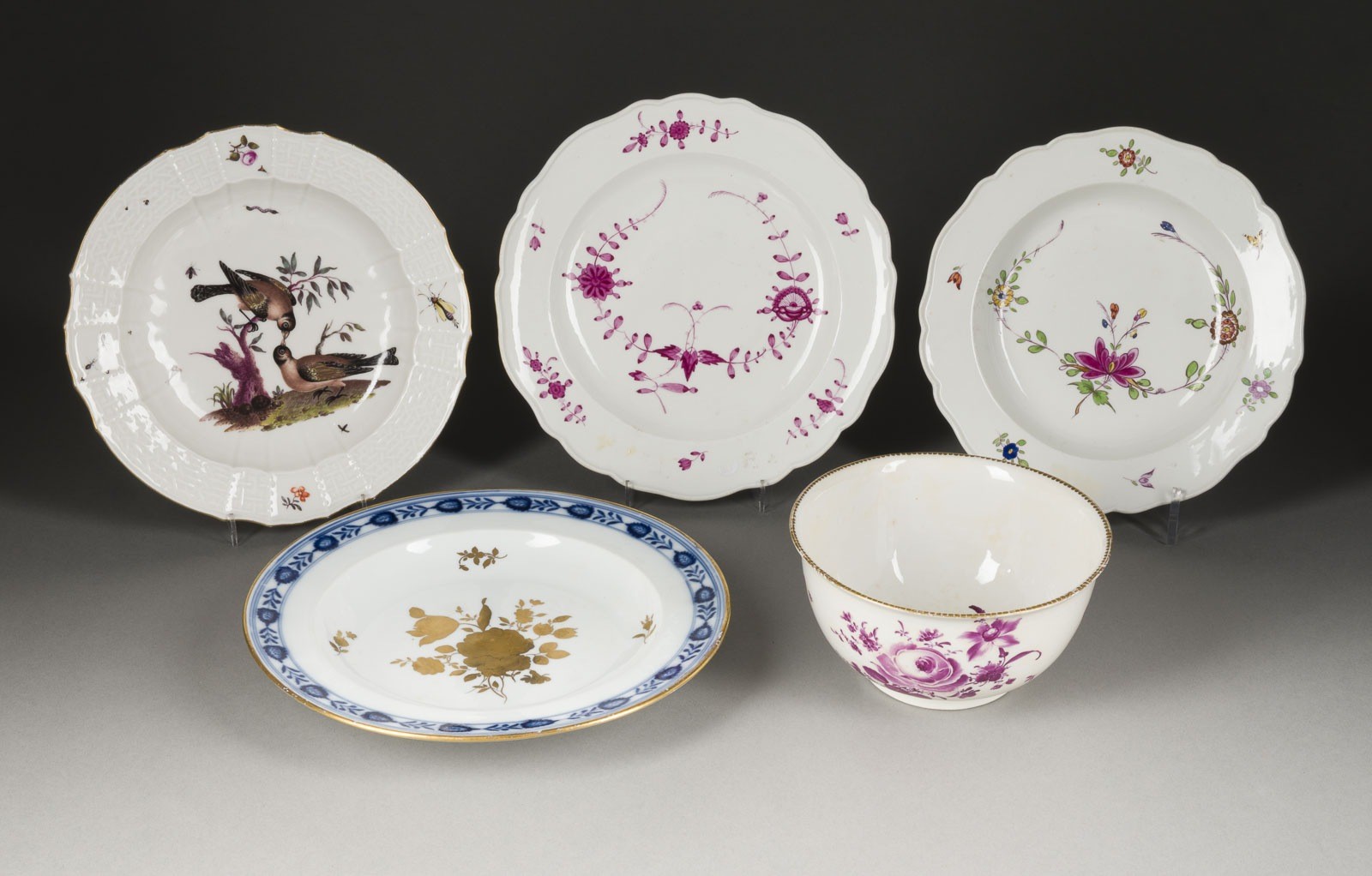 Porzellan, Camaieumalerei in Purpur und polychrome Malerei, Goldstaffage. H. 8,5 cm, D. 23 cm. Unterglasurblaue Schwertermarke (davon zwei Marcolini-Marken). Bestehend aus: 1 Schale, 2 Suppentellern, 2 Tellern. 1. Wahl. Gold part. ber.