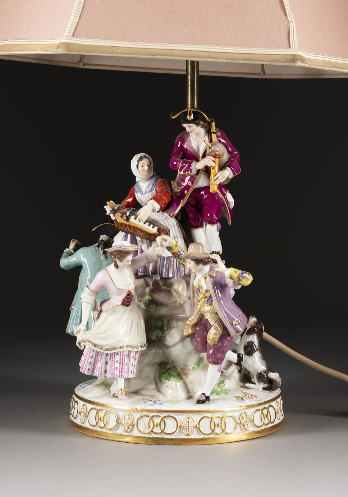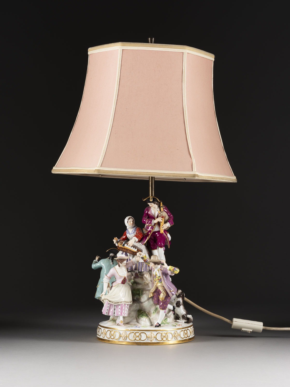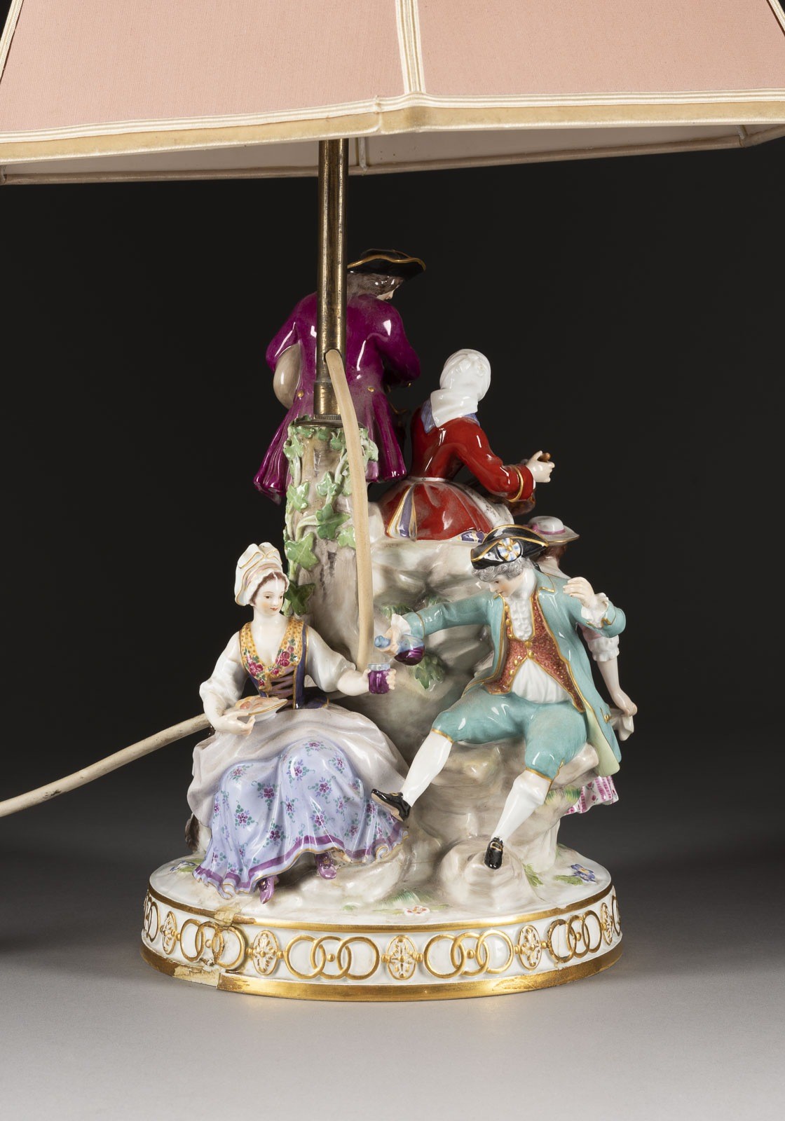 Porzellan, polychrome Malerei, Goldstaffage, Metallmontierung, elektrifiziert (nicht geprüft). G.-H. 65,5 cm. Unterglasurblaue Knaufschwerter, Modellnr. 'D 96'. 1. Wahl. Rest., besch.