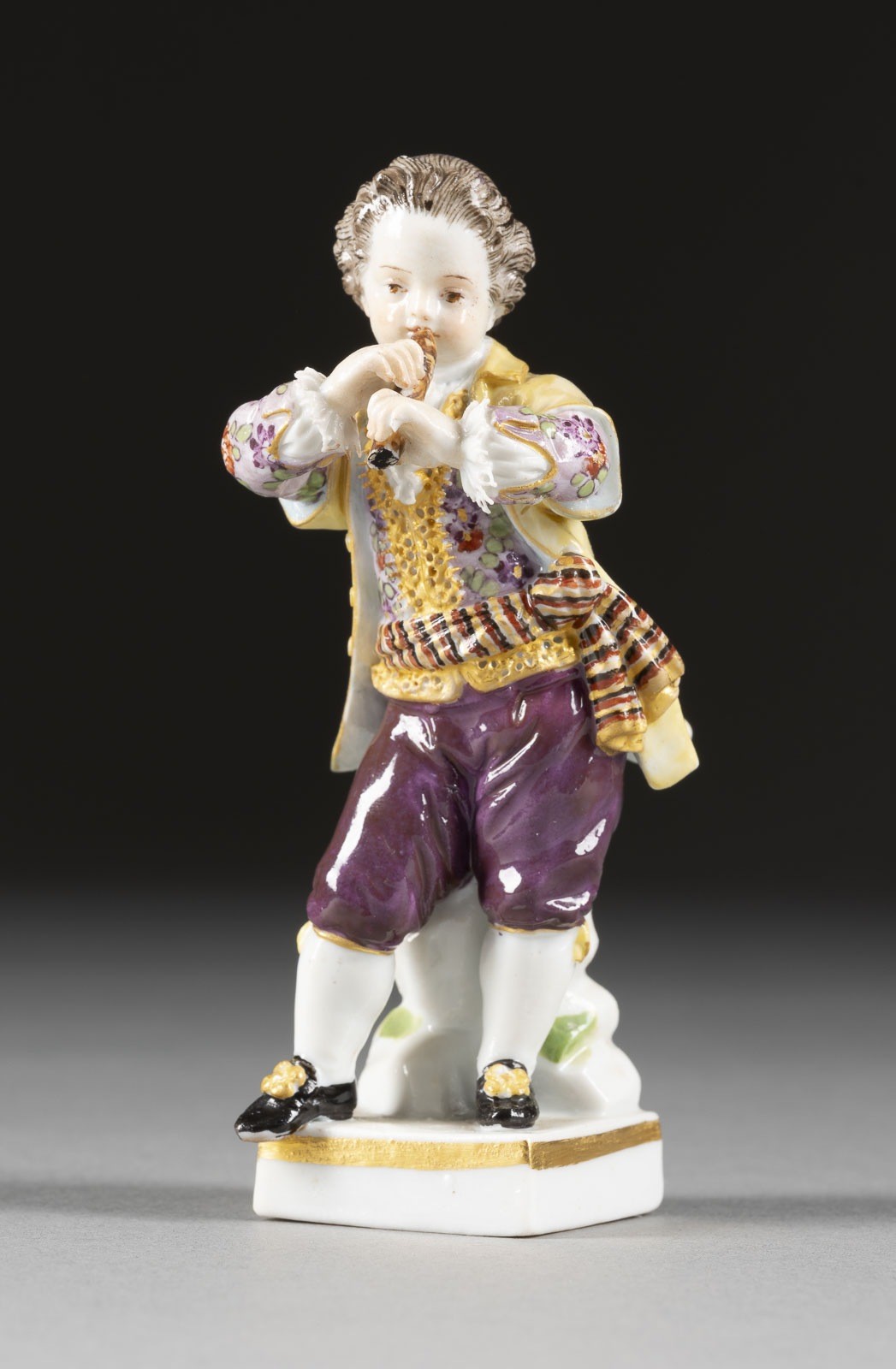 Porzellan, polychrome Malerei, Goldstaffage. H. 10 cm. Unterglasurblaue Knaufschwerter, Pressnummer, Modellnr. 'G 9'. Aus einer Serie von 24 Gärtnerkindern. 1. Wahl. Flöte und ein Finger best.