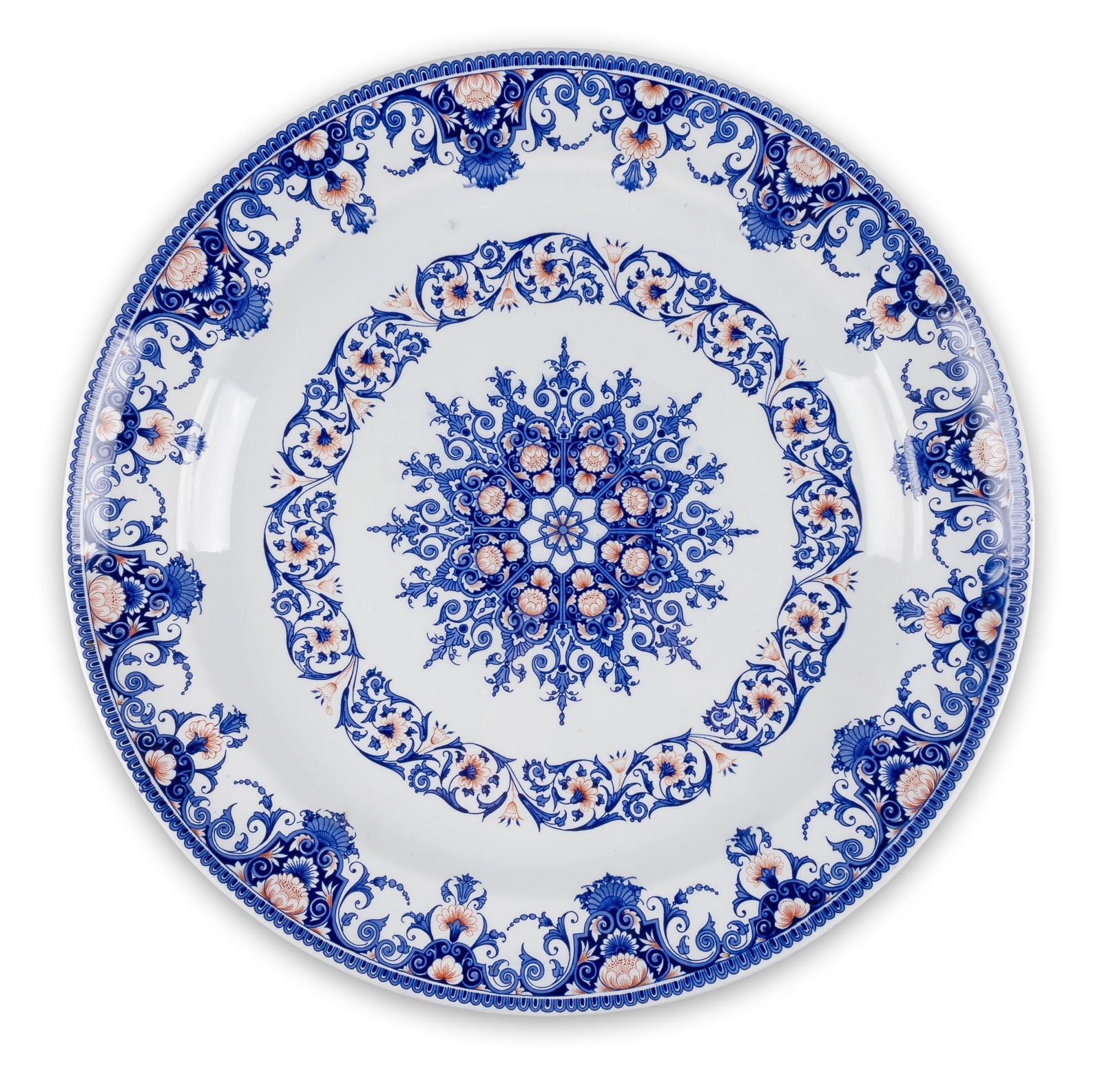 Fayence. D. 49,5 cm. Auf der Unterseite kobaltblauer Werkstatt bzw. Kontrollstrich, Reste eines alten papiernen Inventaretiketts 'Kaiser Fri...ich-Pa/Zimmer N. 251/N.' (undeutlich). Min. Krakelee.
