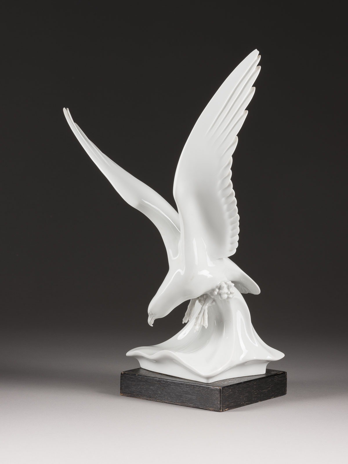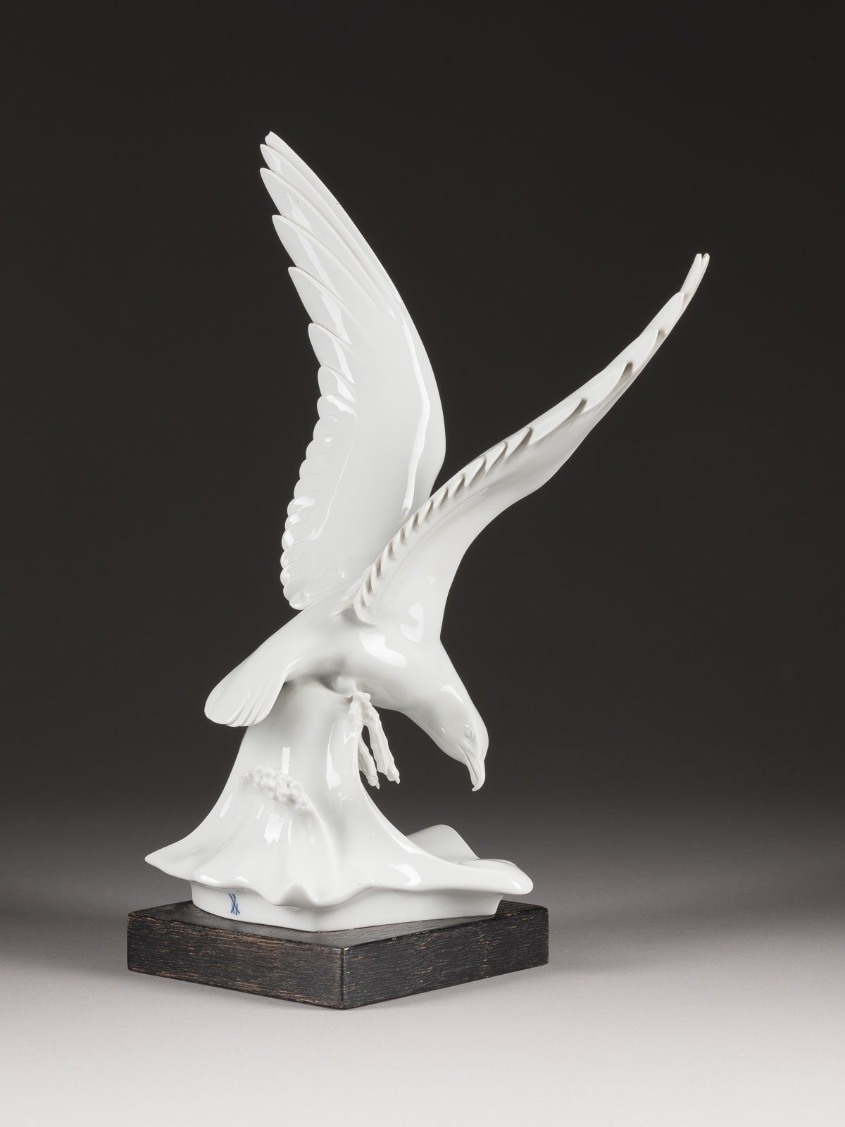 Weißporzellan, glasiert, auf Holzsockel montiert. H. 42 cm. Unterglasurblaue Schwertermarke. 4. Wahl. Zwischen den Flügeln ein Brandriss, Flügel an Spitzen best.
