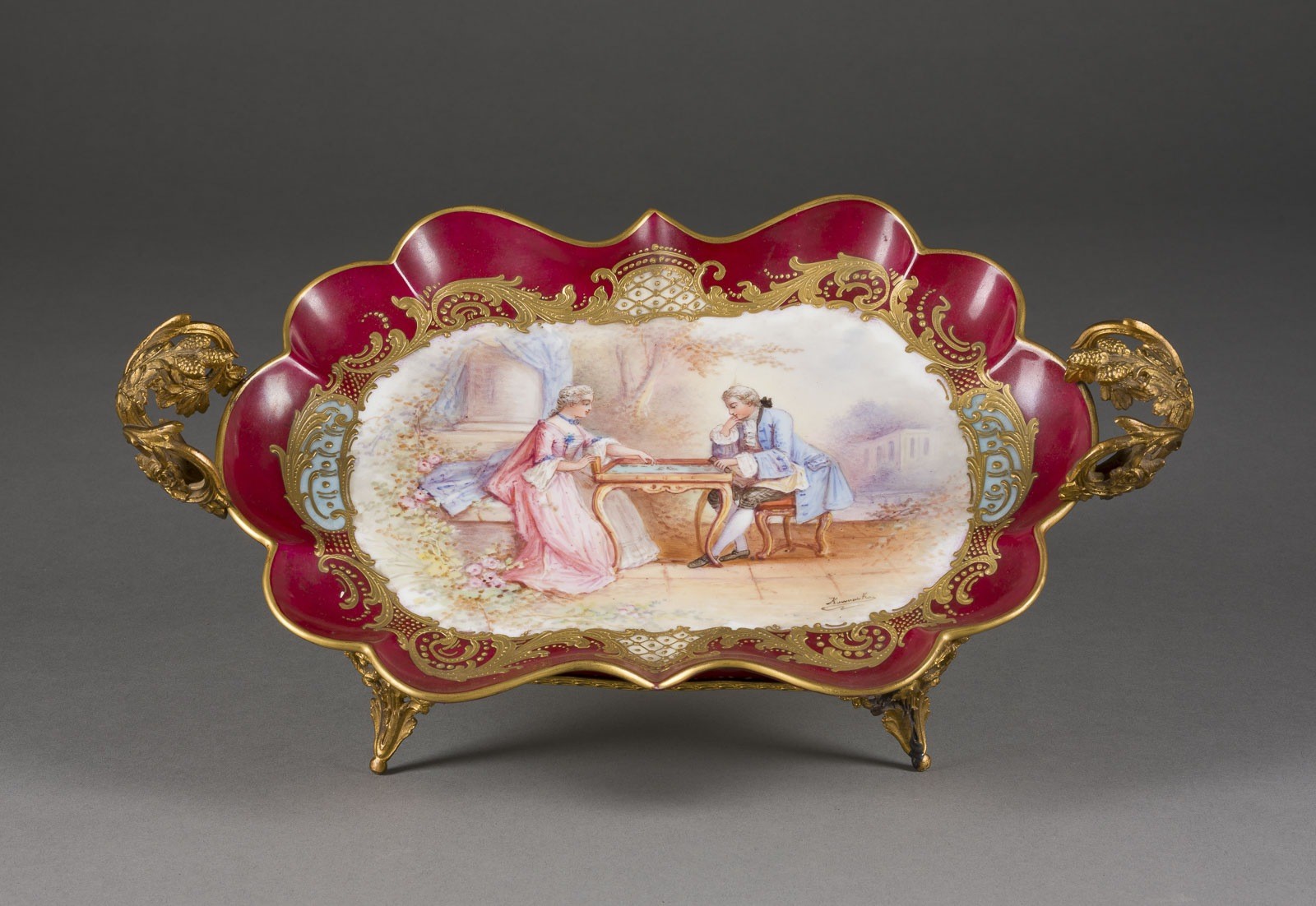 Porzellan, polychrome Malerei, teilweise Purpurfond, Goldstaffage, Metallmontierung. L. 34,5 cm. Firmenmarken, Markenzeichen von 'Château des Tuileries', im Bild bez. (unleserlich).