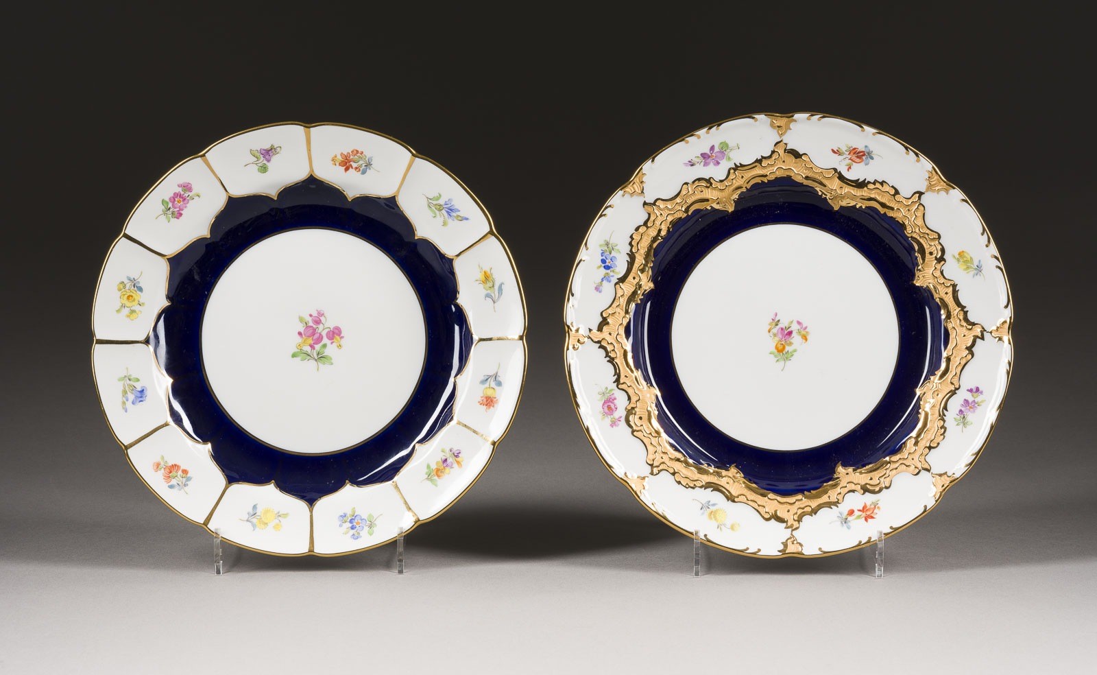 Porzellan, teilweise kobaltblauer Fond, polychrome Malerei, Goldstaffage. D. 20 cm. Unterglasurblaue Schwertermarke, Press- und Malernummer, Vergoldernummer, Modellnr. 1. Wahl.
