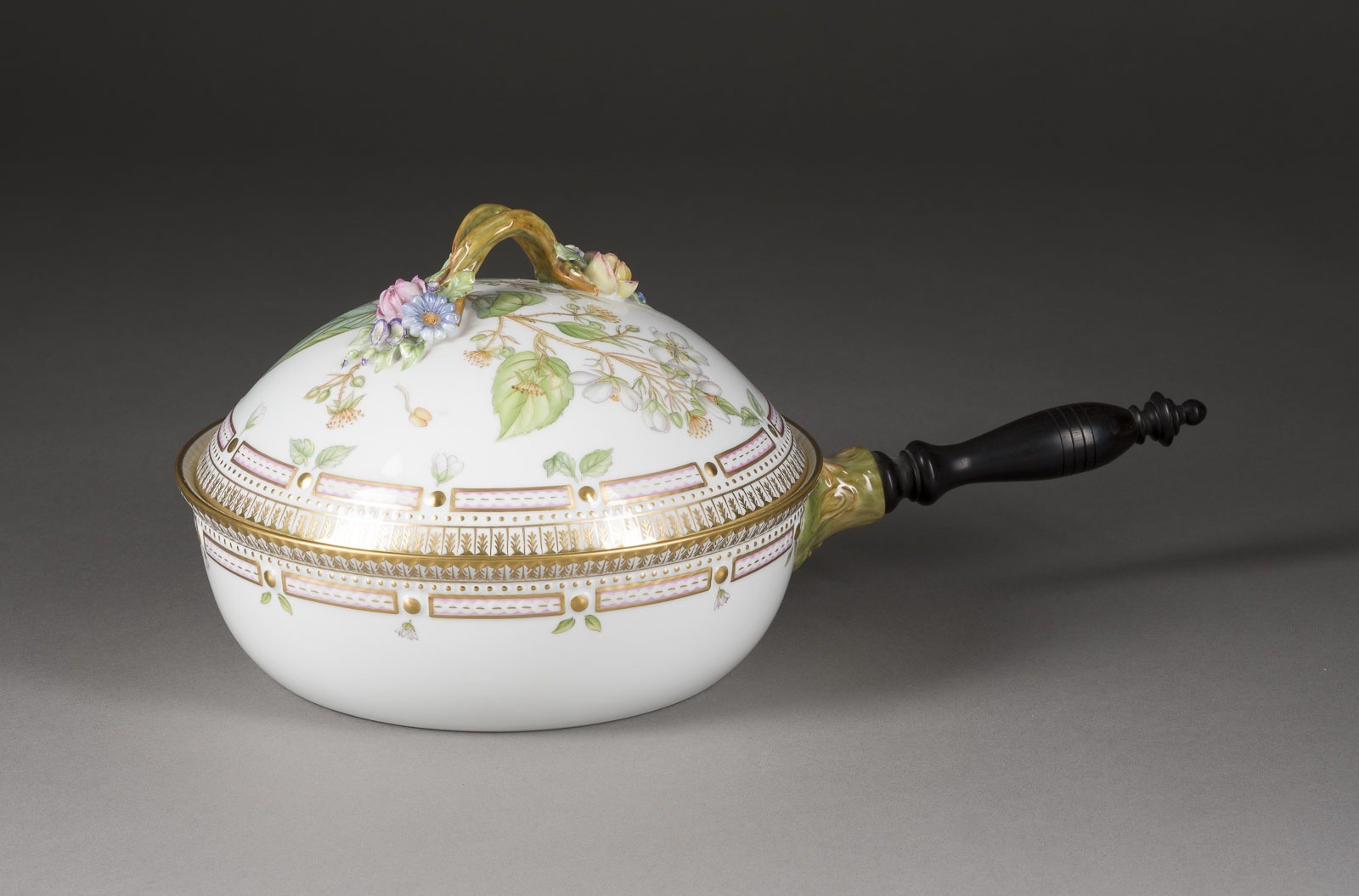 Porzellan, polychrome Malerei, Goldstaffage, ebonisiertes Holz. G. 23,5 cm. Grüne Manufakturmarke, blaue Wellenmarke, Malerzeichen, Modellnr. Deckel verso bez. mit botanischen Namen in Schwarz. 1. Wahl.