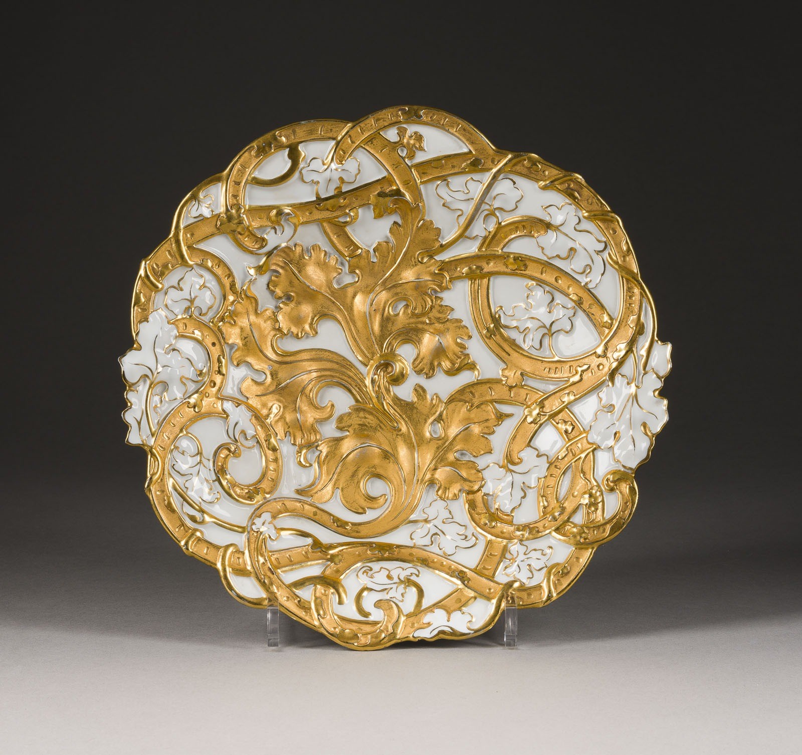 Porzellan, glänzende und matte Goldstaffage. D. 29,5 cm. Unterglasurblaue Pfeiffer-Marke, Pressnummer, Modellnr. 'Z160' (undeutlich). 1. Wahl. Gold part. ber.