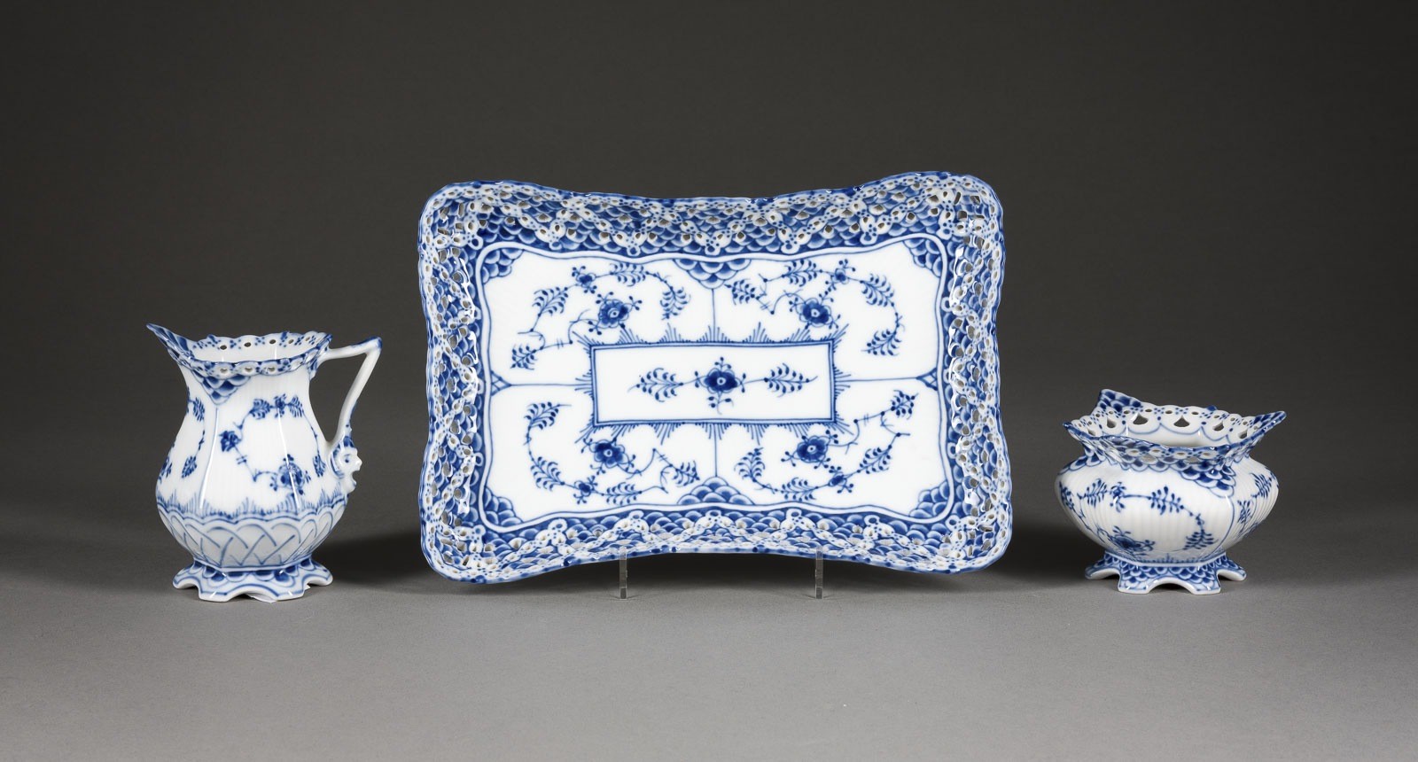 Porzellan, Blaumalerei. H. 10 cm (Milchkännchen), H. 7 cm (Zuckerdose), L.. Blaue Wellenmarke, grüner Manufakturstempel, Malerzeichen, Modellnr. Tablett mit doppelter Spitzenbordüre. 1. Wahl.