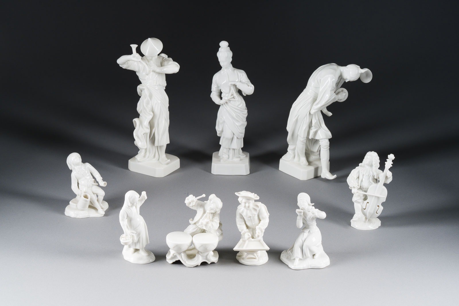 Weißporzellan. H. 10,3-27,5 cm. Unterglasurblaue Manufakturmarke 'Hochst', part. Pressnummer. Bestehend aus: drei Figuren aus der chinesischen Kapelle: Serpentspieler (2. Wahl),
