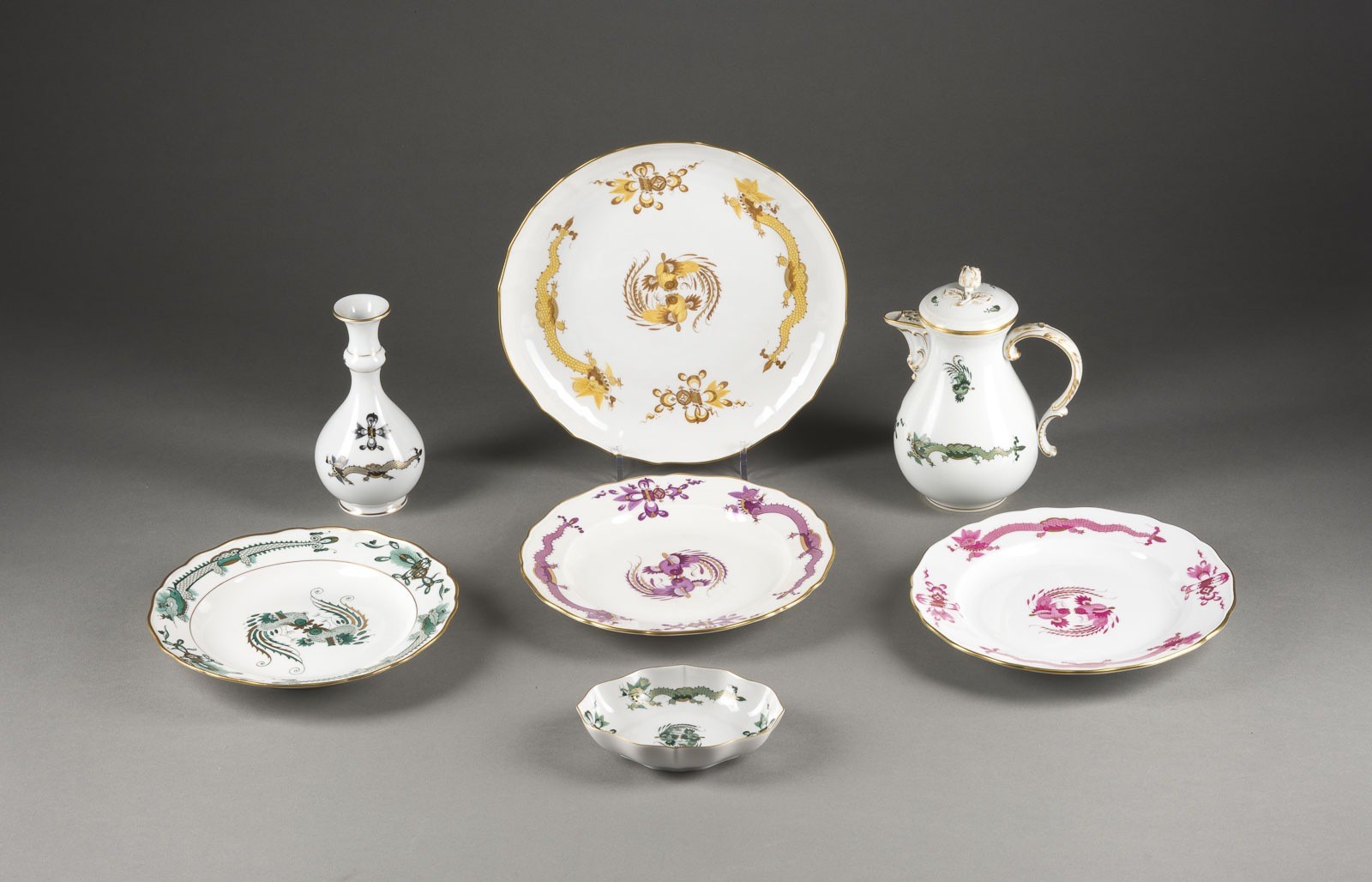 Porzellan, Camaieumalerei in Lila, Schwarz, Gelb und Grün, Goldstaffage. H. 18,5 cm (Vase), H. 21 cm (Kaffeekanne). Unterglasurblaue Schwertermarke ( einmal Knaufschwerter und Pfeiffer), Press- und Malernummer, part. Jahreszeichen, Modellnr. Bestehend aus: 1 Kaffeekanne, 1 Vase, 3 Tellern, 1 Schüssel, 1 Schale. 1./2. Wahl.