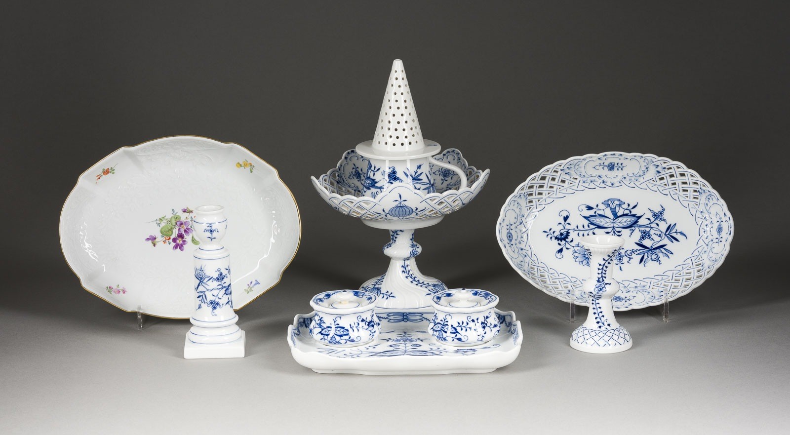Porzellan, Blaumalerei, part. polychrome Malerei und Goldrand. L. 24,5-25 cm (Schale). Unterglasurblaue Schwertermarke, part. Press- und Malernummer, part. Modellnr. Bestehend aus: Schreibgarnitur, 2 Kerzenhaltern, 1 Fußschale, 2 Schalen, 1 Teesieb. 1./2. Wahl. Part. min. besch.