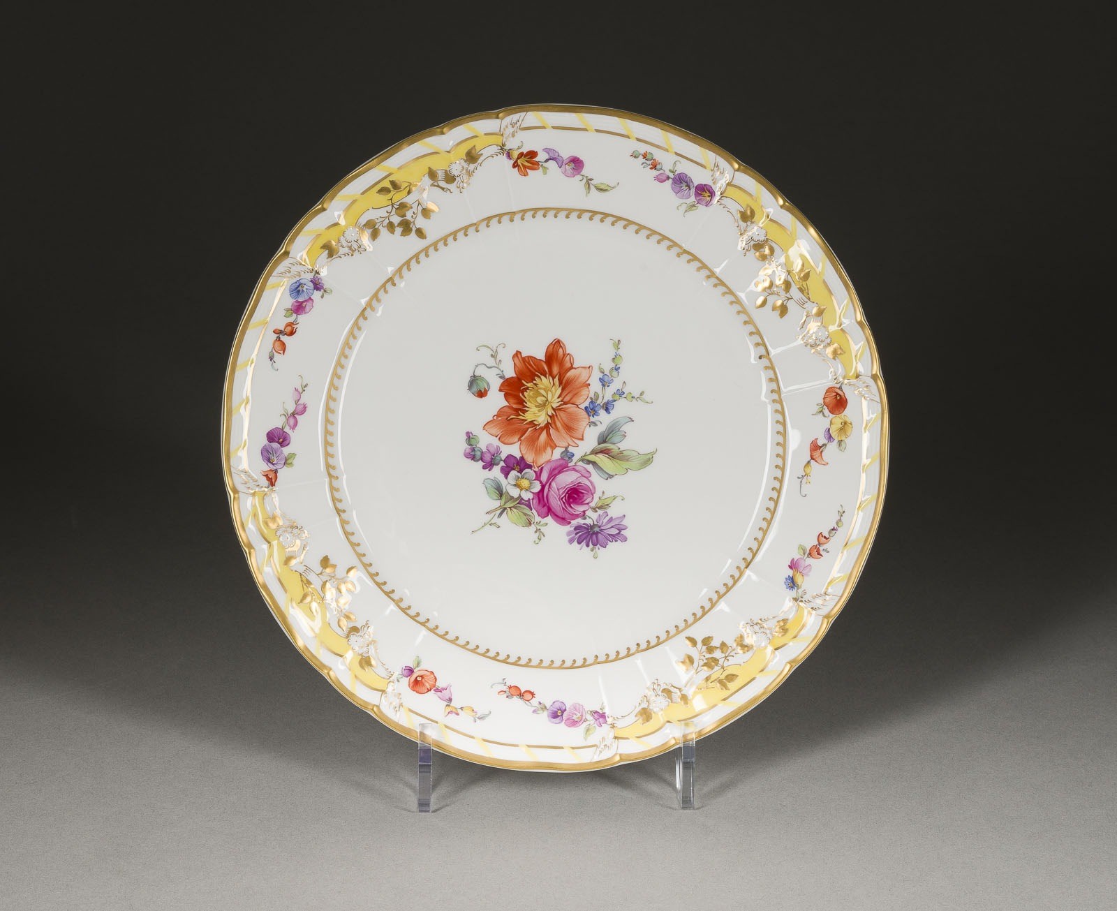 Porzellan, polychrome Malerei, Goldstaffage. D. 26 cm. Unterglasurblaue Zeptermarke, roter Reichsapfel mit KPM, Pinselzeichen.