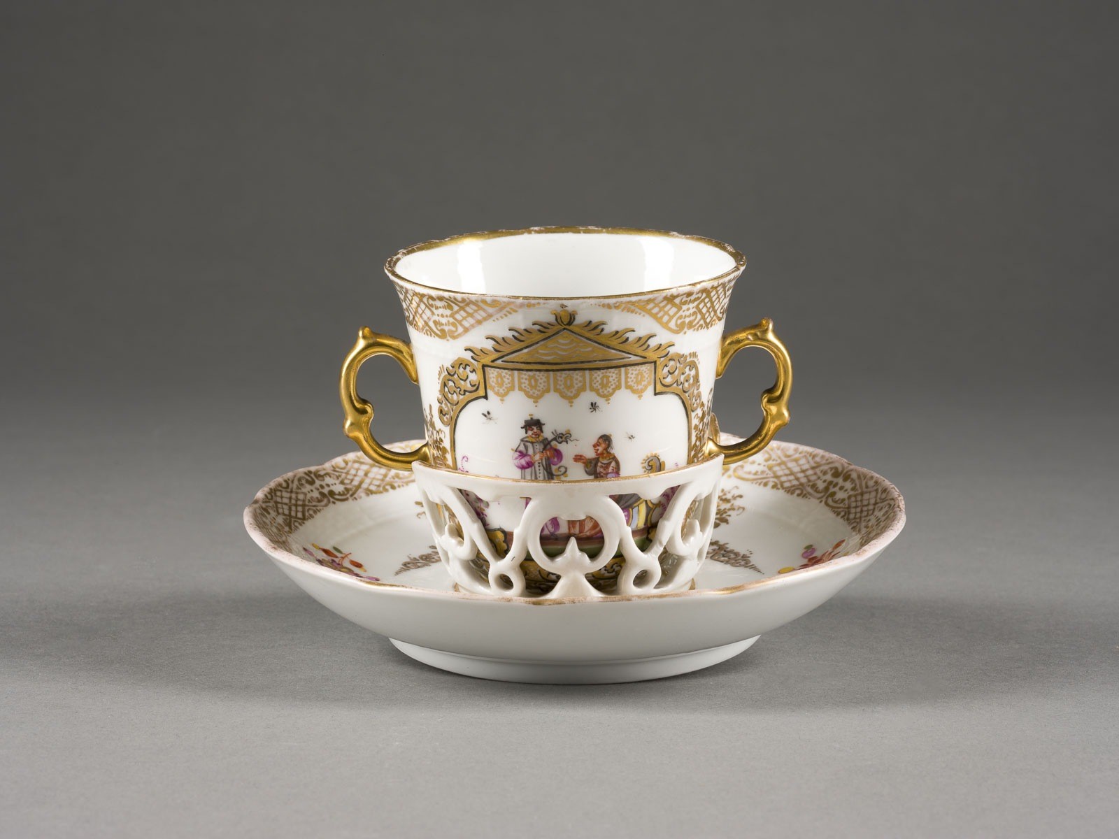 Porzellan, polychrome Malerei, Goldstaffage. H. 7,2 cm (Tasse), D. 14 cm (Untertasse). Unterglasurblaue Zeptermarke, Pressnummer. Form: Ozier.