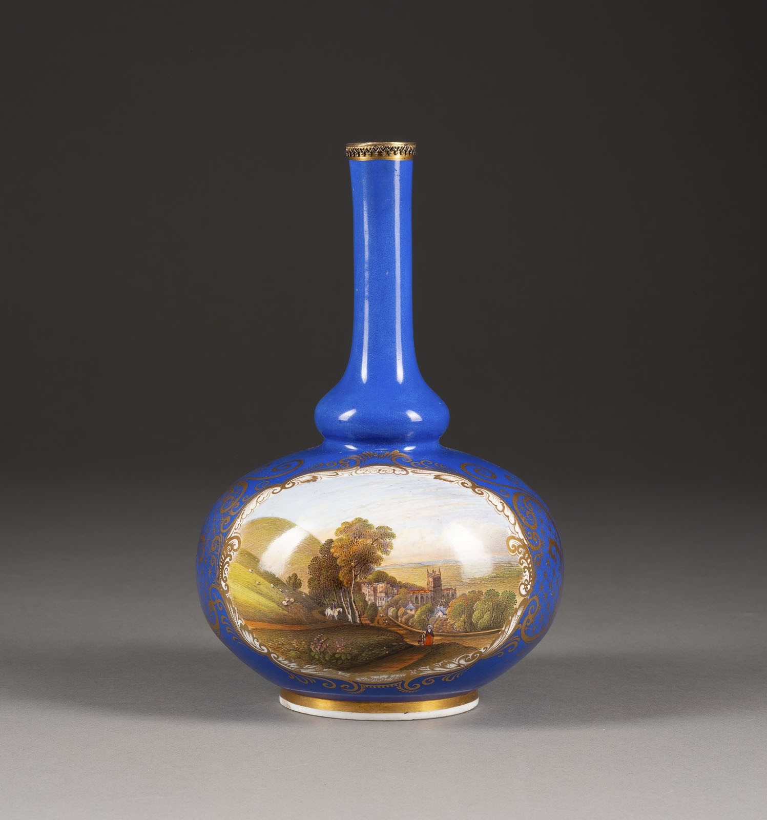 Porzellan, polychrome Malerei, Goldstaffage, Blaufond, Montierung. H. 23,5 cm. Min. best.