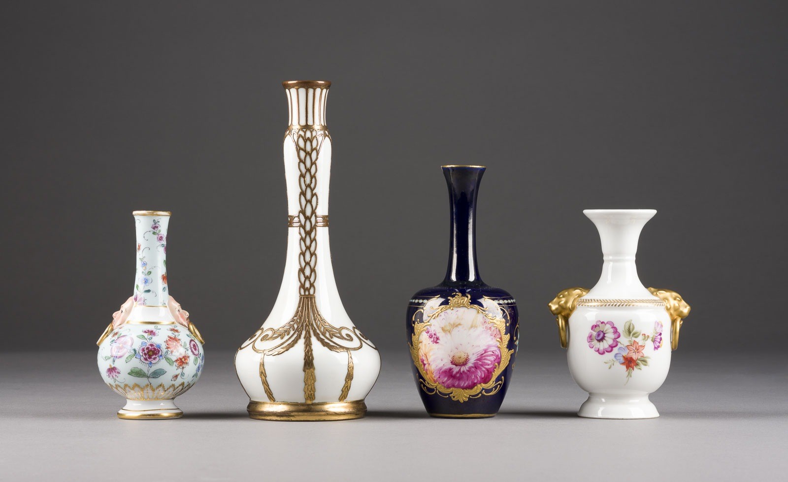 Porzellan, polychrome Malerei, bunte Emailmalerei, Goldstaffage, Metallauflage. H. 11,5 - 18,5 cm. Unterglasurblaue Zeptermarke, part. roter Reichsapfel mit KPM, part. Press- bzw. Malernummern, einmal Modellnummer '5674'. Eine Vase an Mündung besch., Gold part. min. ber. Eine Vase ohne Marke.