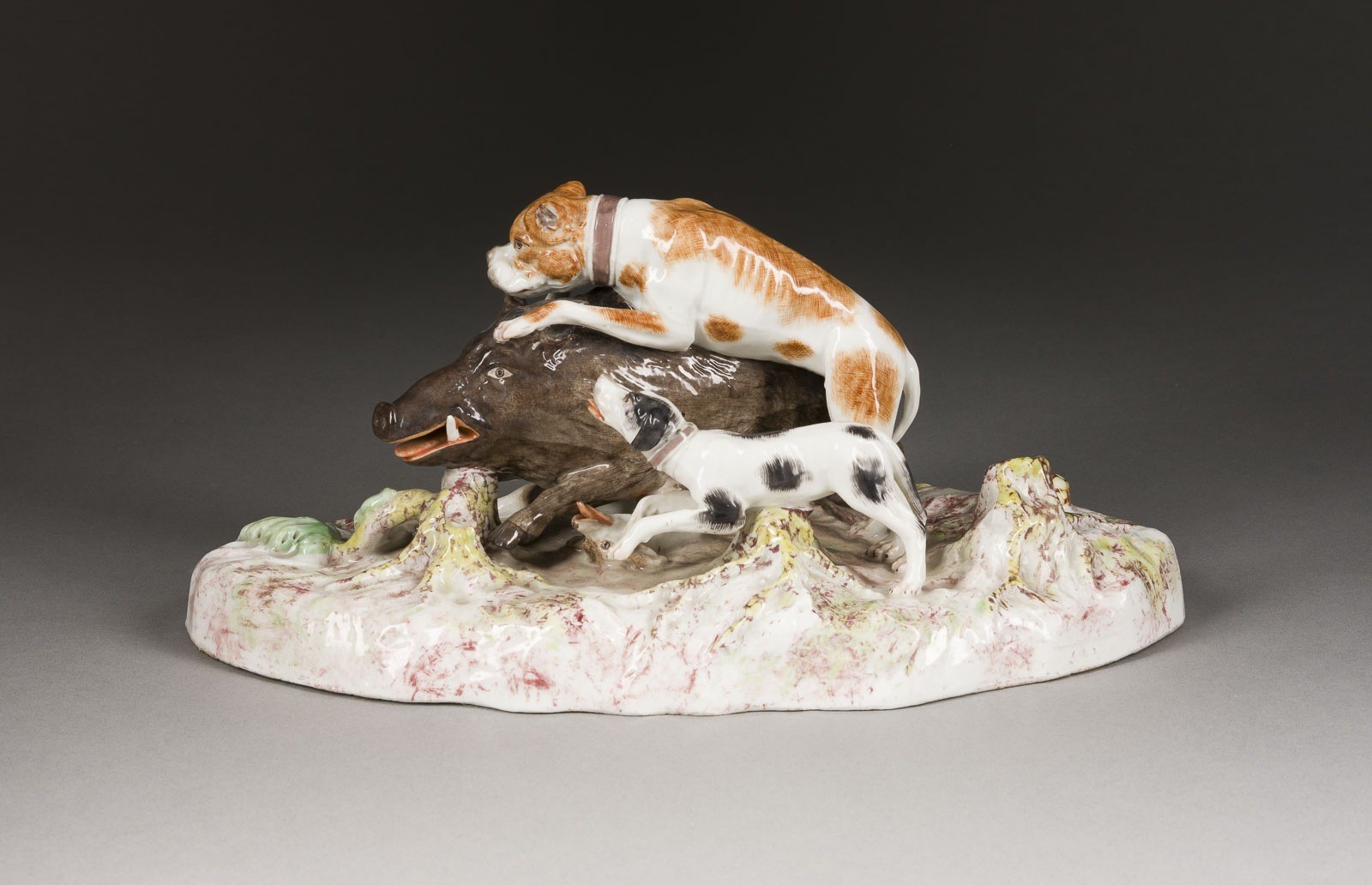 Porzellan, polychrome Malerei. H. 13,5 cm, L. 31 cm. Unterglasurblaue Radmarke, eingepresstes 'I'. Ohr min. best., Schwanz min. besch.
