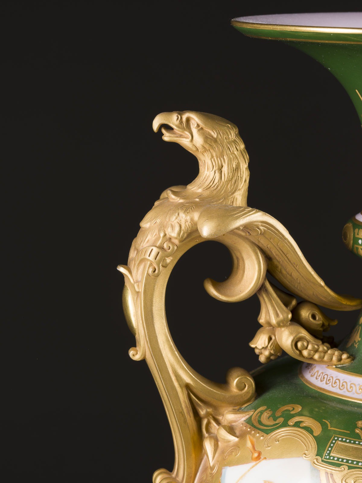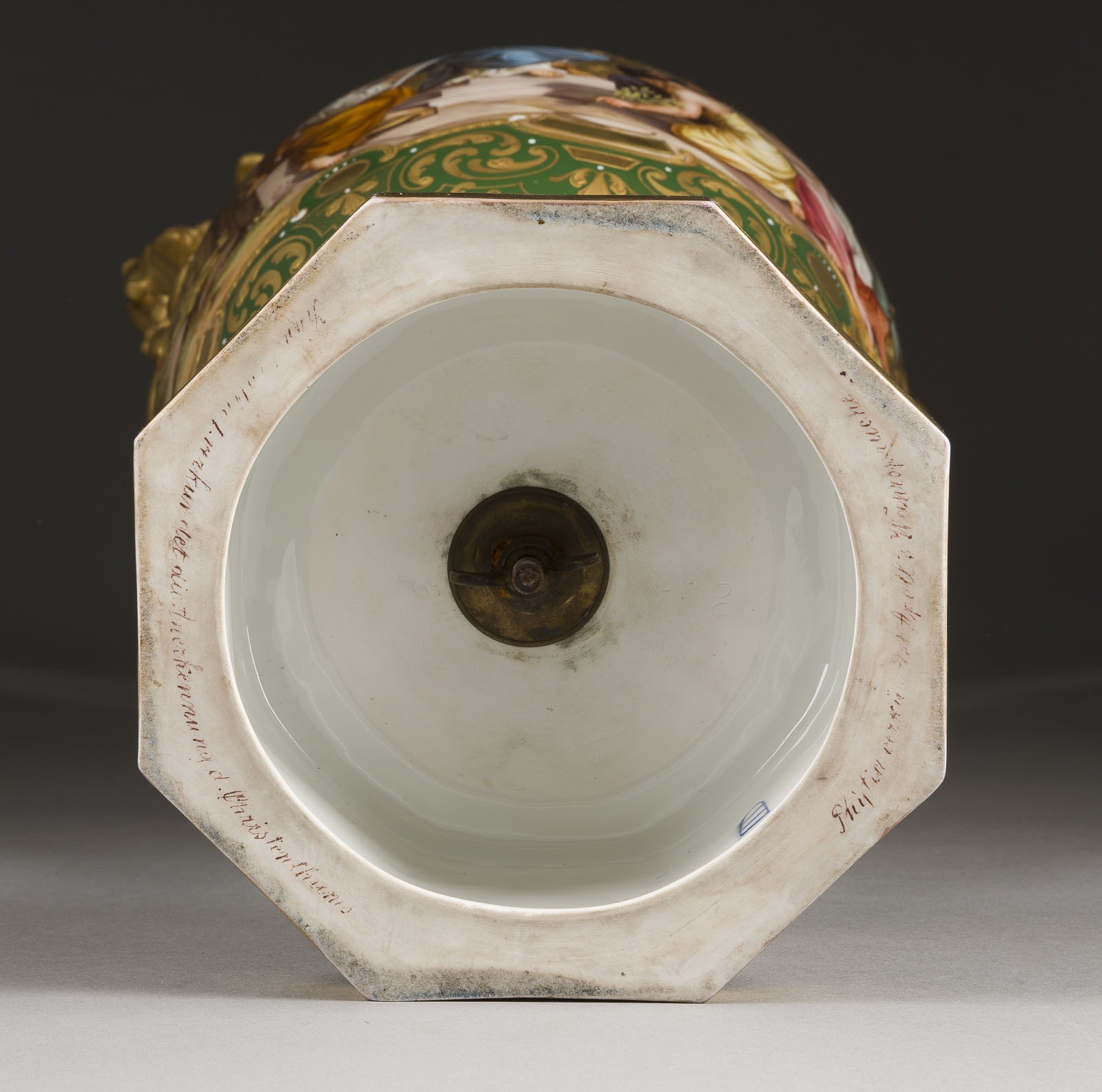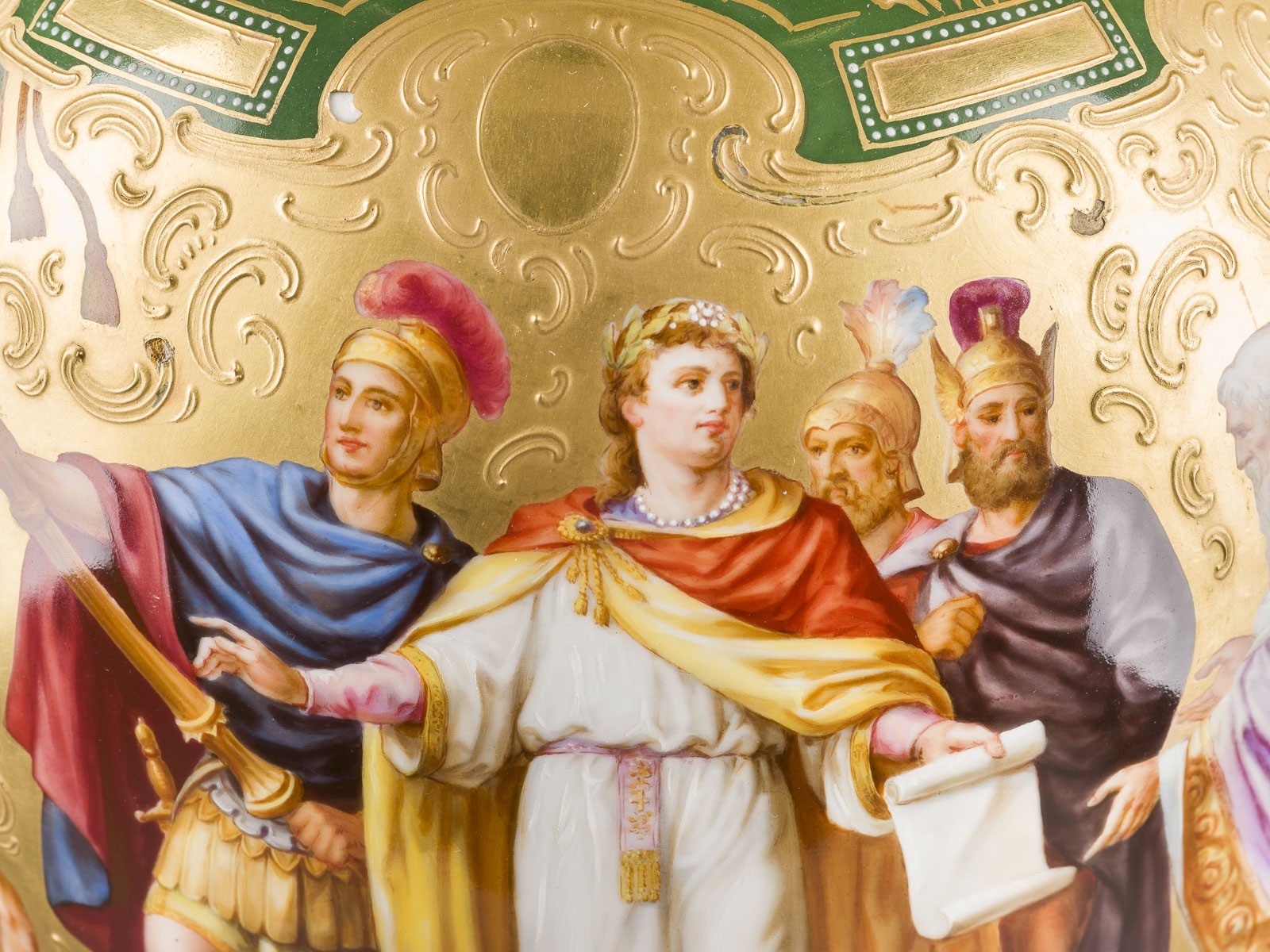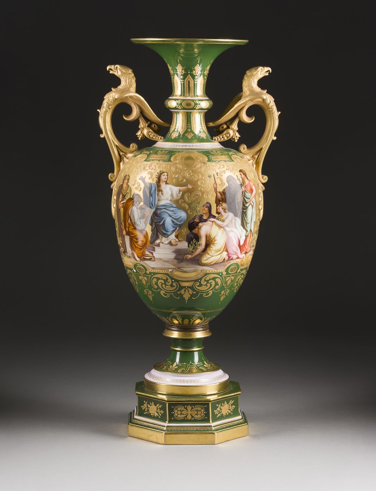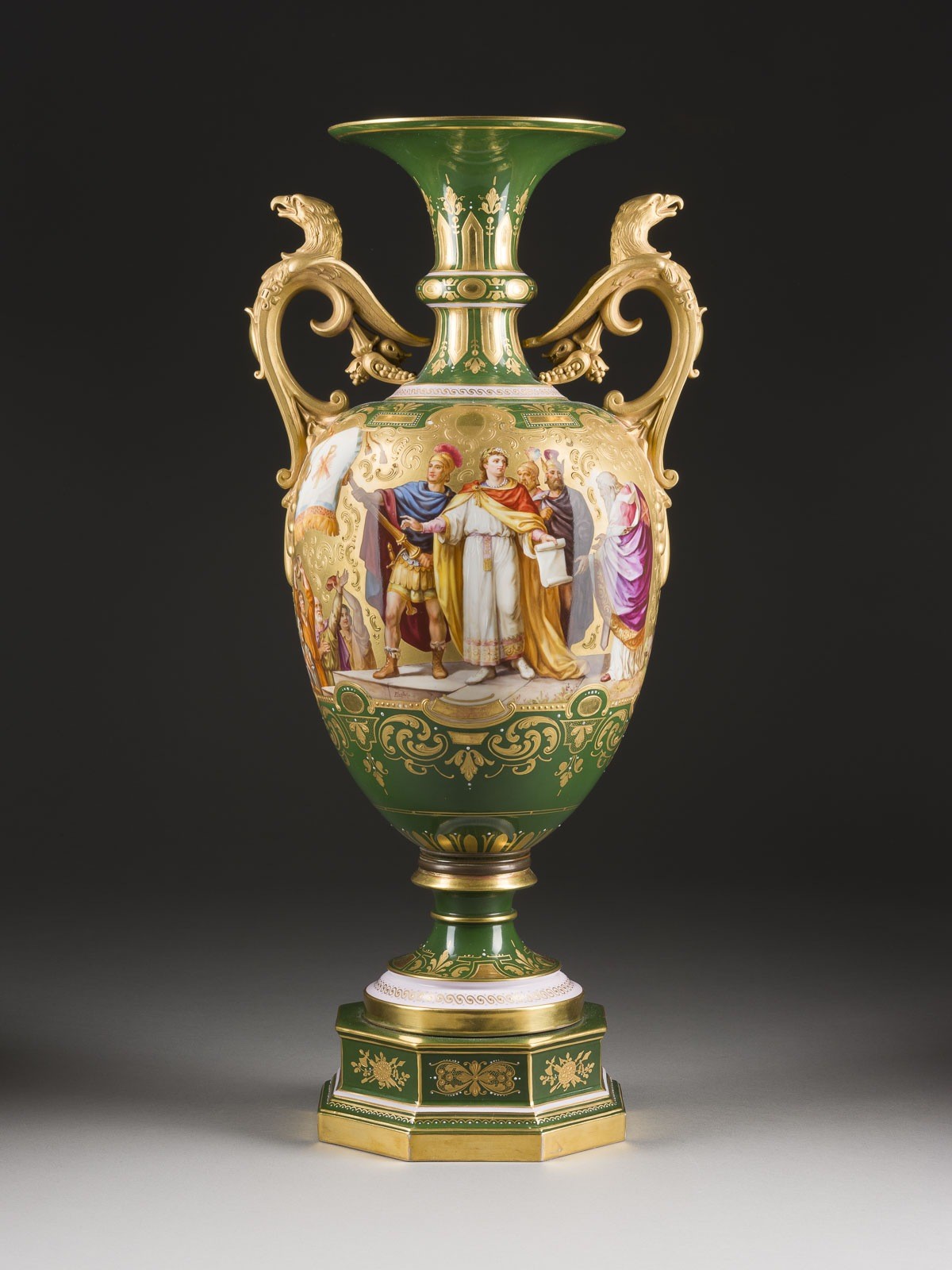Porzellan, farbiger Fond, polychrome Malerei, glänzende und matte Goldstaffage. H. 54 cm. Unterglasurblaue Bindenschildmarke, Pressnummer. Im Bild bez. 'F. Lesleh'. Darstellung des Kaisers Konstantin und Alegorie der Kunst. Gold. part. min. ber., Montierung gelockert.