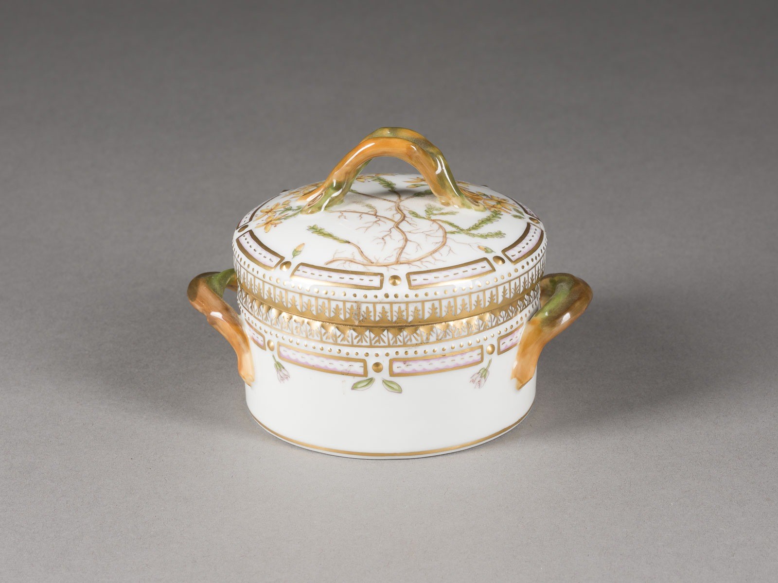 Porzellan, polychrome Malerei und Goldstaffage. D. 8 cm (ohne Griffe), H. 5 cm. Grüne Manufakturmarke, blaue Wellenmarke, Malerzeichen, Modellnr. Deckel verso bez. mit botanischen Namen in Schwarz. 1. Wahl.
