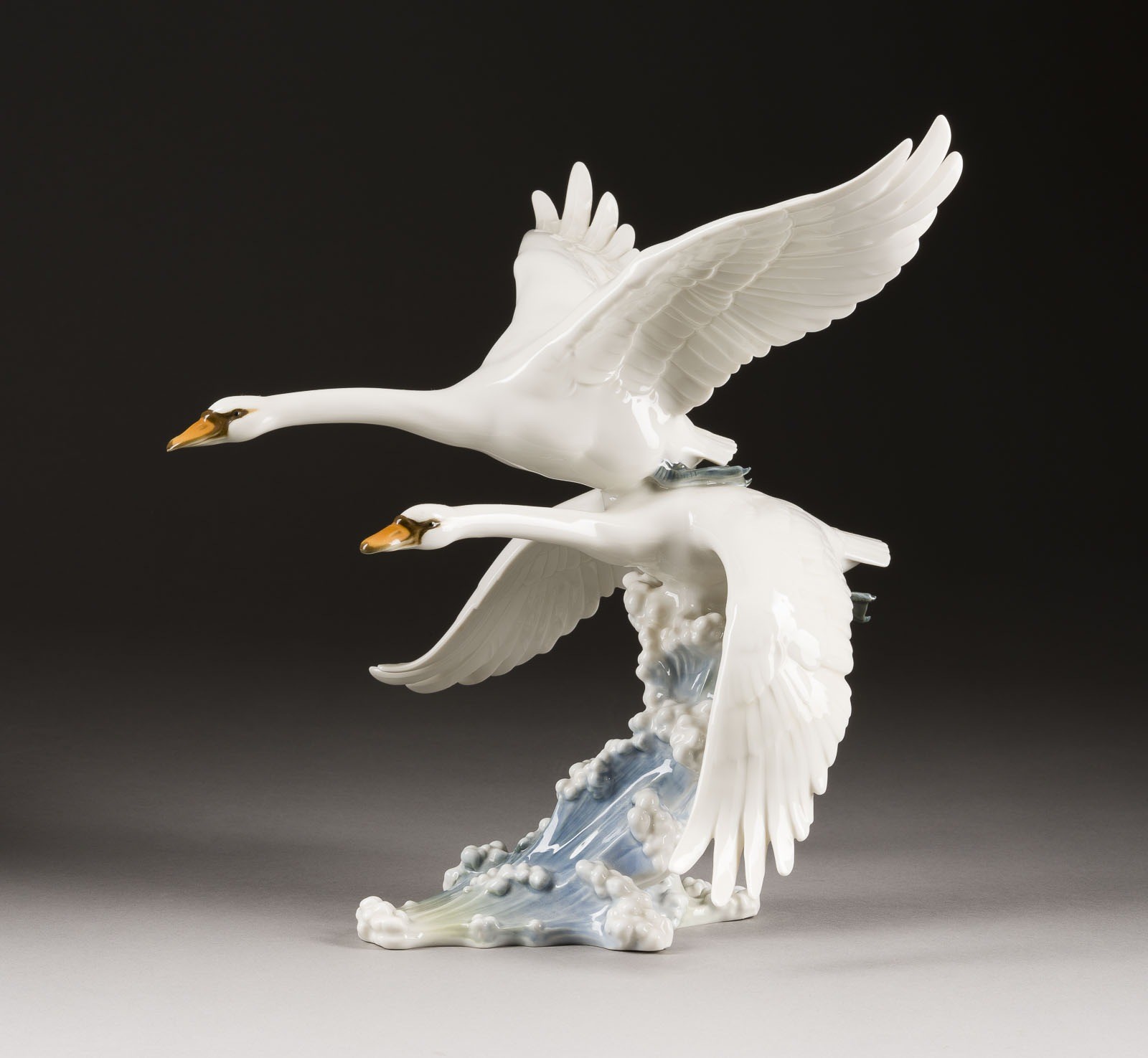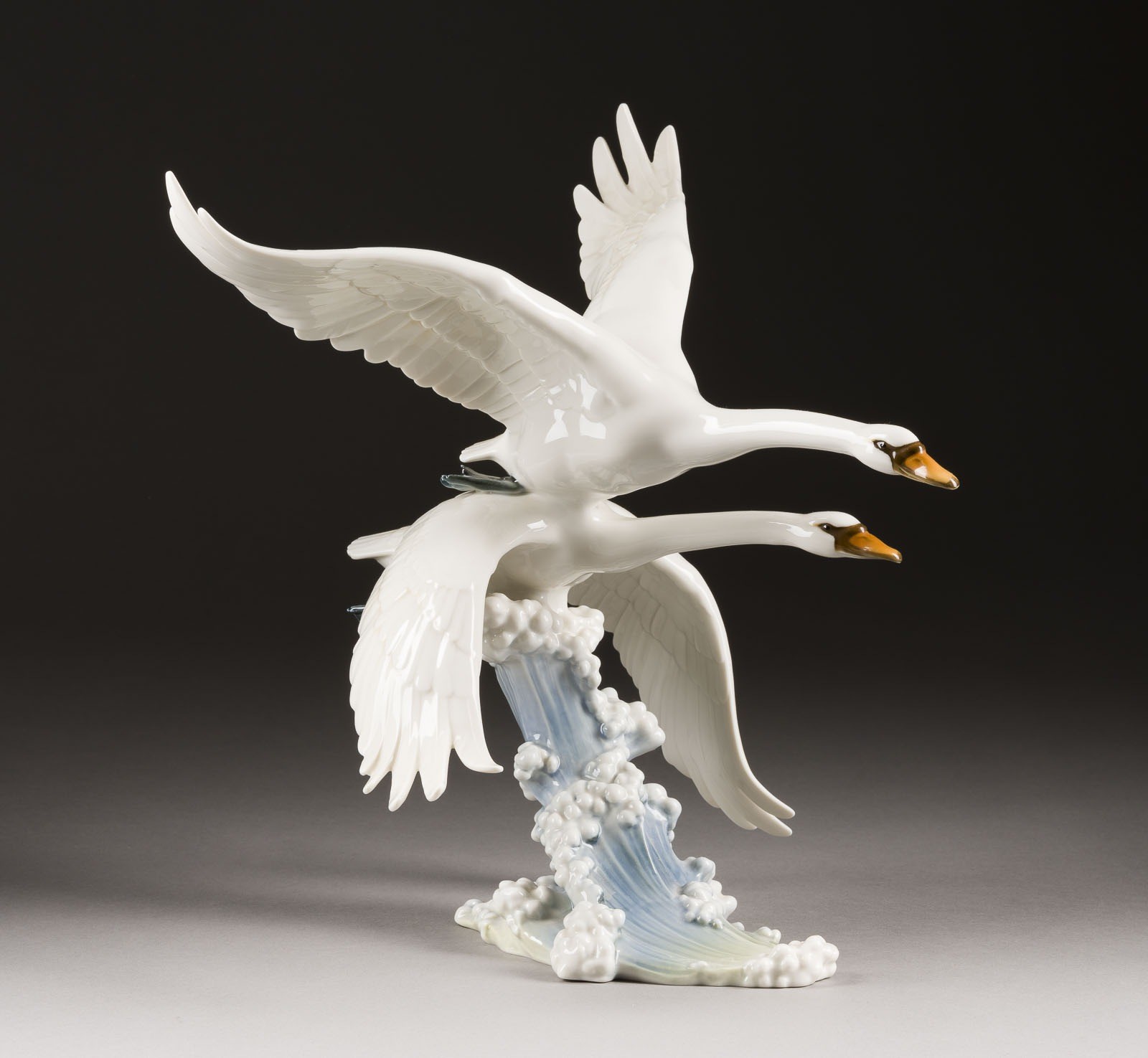 ZWEI FLIEGENDE SCHWÄNE AUF WELLENSOCKEL