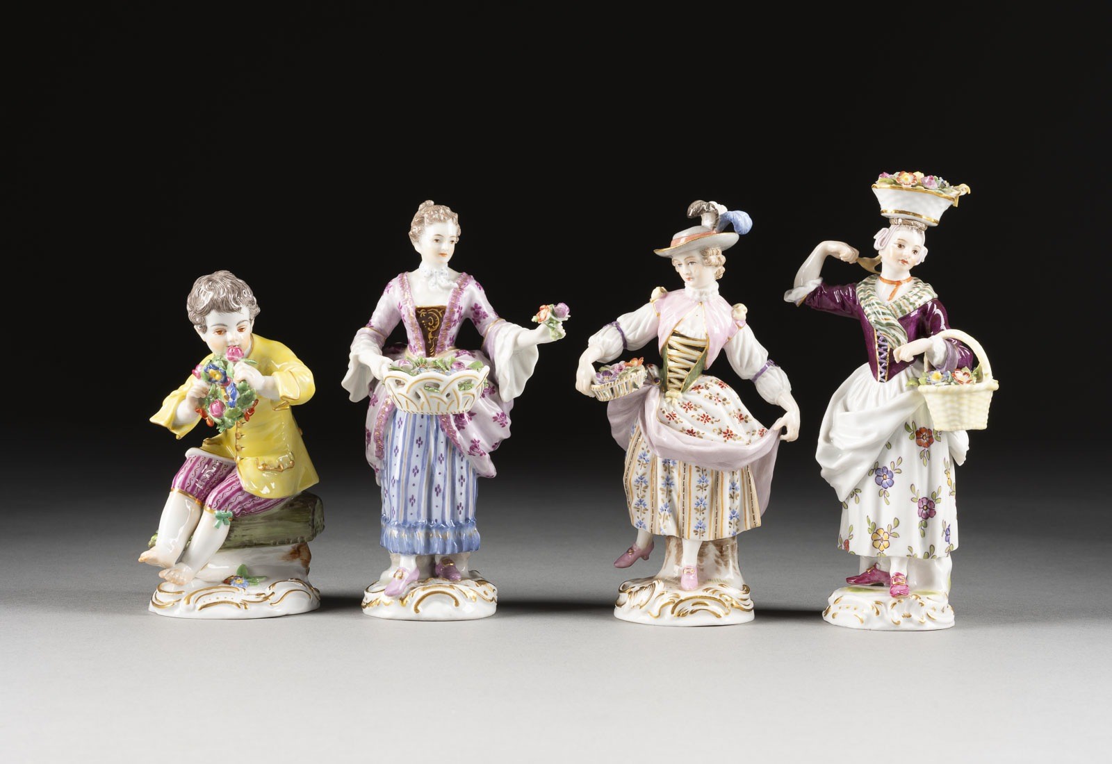 Porzellan, polychrome Malerei, Goldstaffage. H. 11,5 - 15,5 cm. Unterglasurblaue Schwertermarke (darunter Knaufschwerter), Press- und Malernummer, Modellnr. Peter Reinicke: 1 Händlerin mit Körben (Modell '8') und 1 Blumenhändlerin (Modell '28')