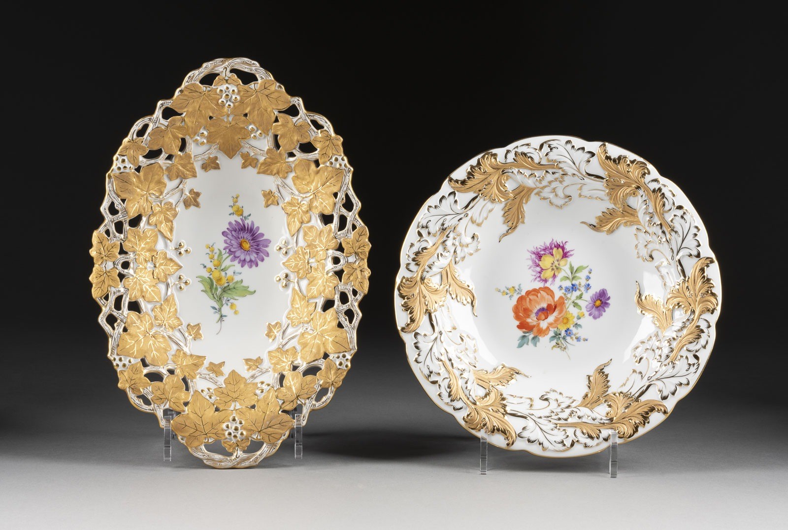 Porzellan, polychrome Malerei, glänzende und matte Goldstaffage. D. 25,5 cm, L. 32 cm. Unterglasurblaue Schwertermarke, Press-, Maler- und Vergoldernummer, Jahreszeichen, Modellnr. 1 runde, tief gemuldete Schale mit reliefiertem Rankenmotiv auf der Fahne. 1 ovale Schale