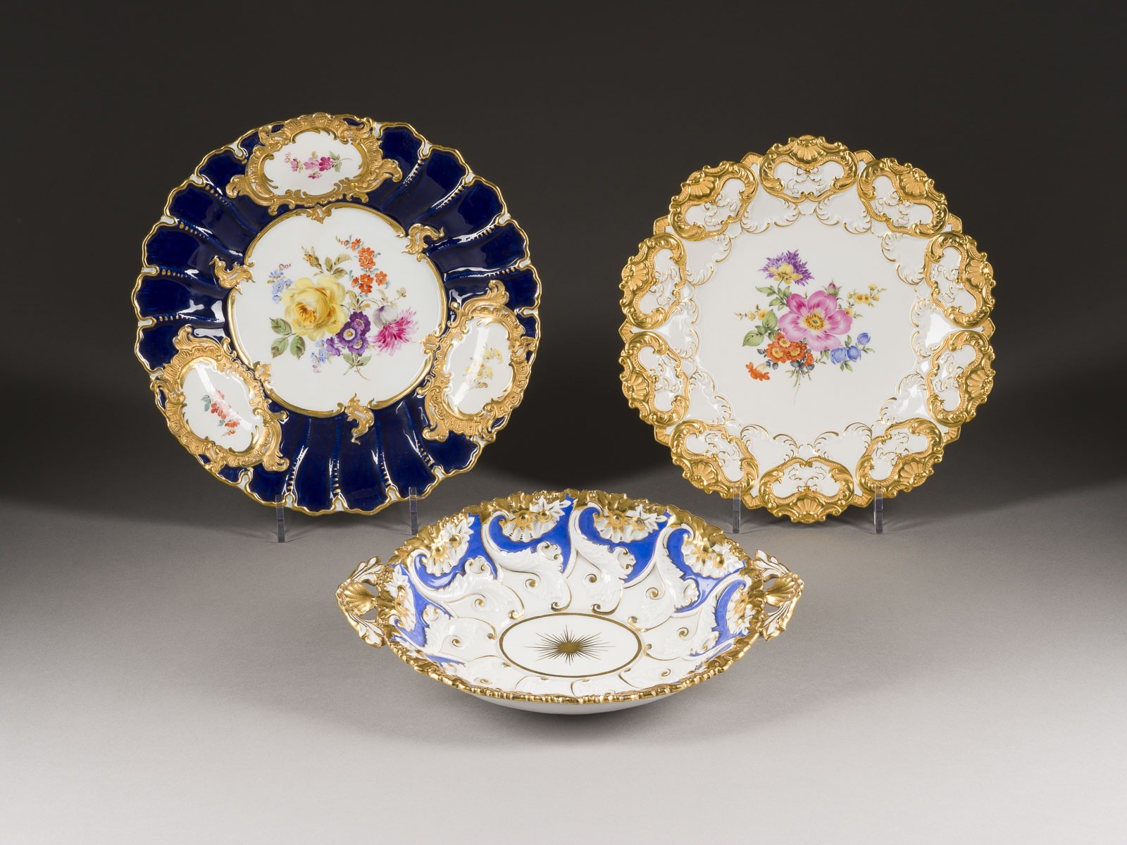 Porzellan, teilw. polychrome Malerei, teilw. kobaltblauer Fond, glänzende und matte Goldstaffage. L. 30,5 cm, D. 27,5-29,5 cm. Unterglasurblaue Schwertermarke (davon einmal Knaufschwerter), Press- und part. Malernummer, part. Jahreszeichen, Modellnr. 1. Wahl und einmal 2. Wahl. Schale mit Haarriss.