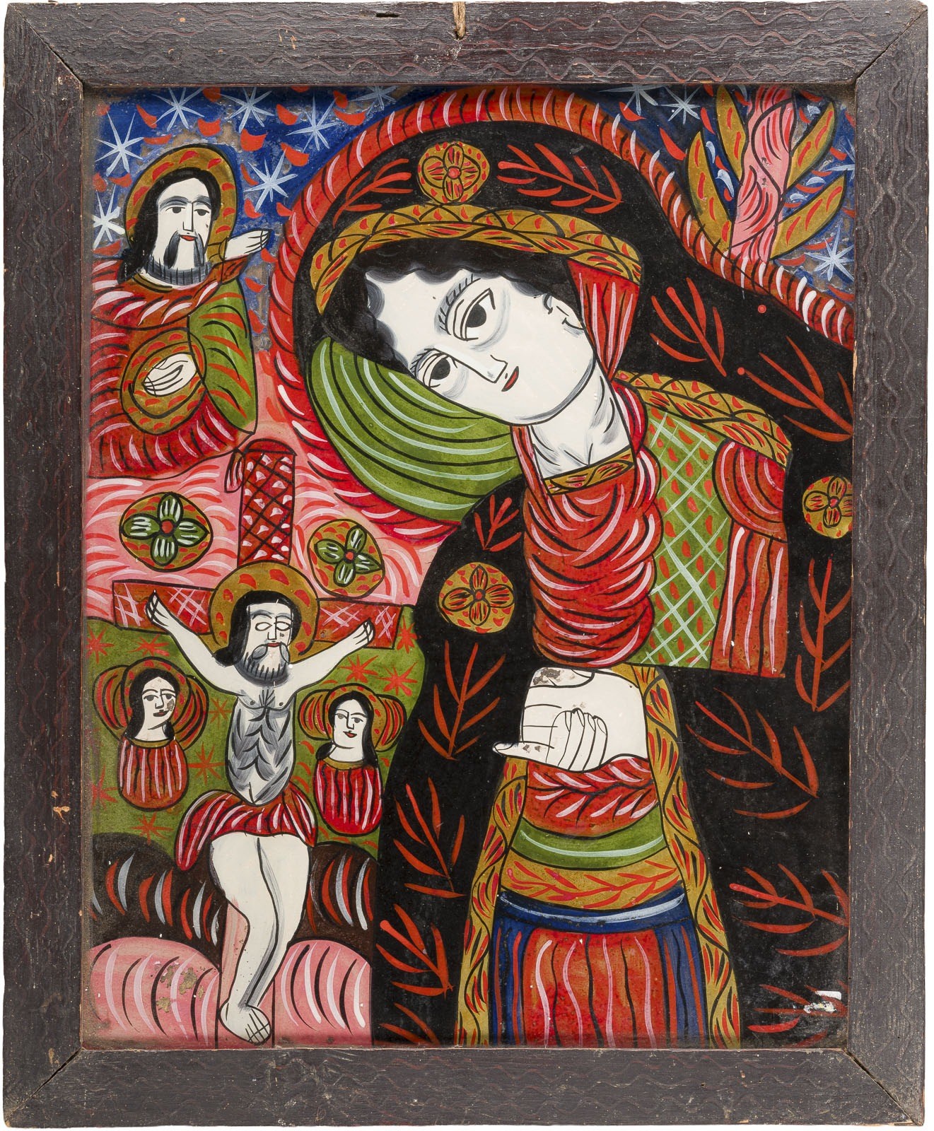 Polychrome Malerei hinter Glas. 66 x 54,6 cm. Substanzverluste.