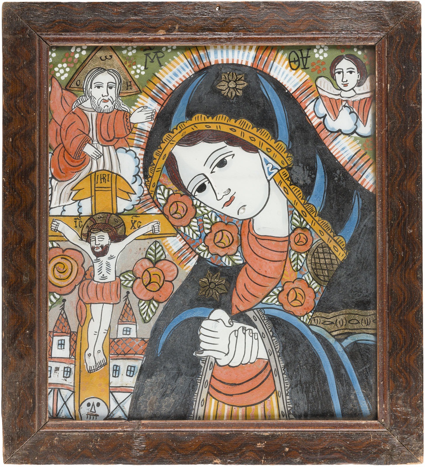 HINTERGLAS-IKONE MIT DER TRAUERENDEN GOTTESMUTTER