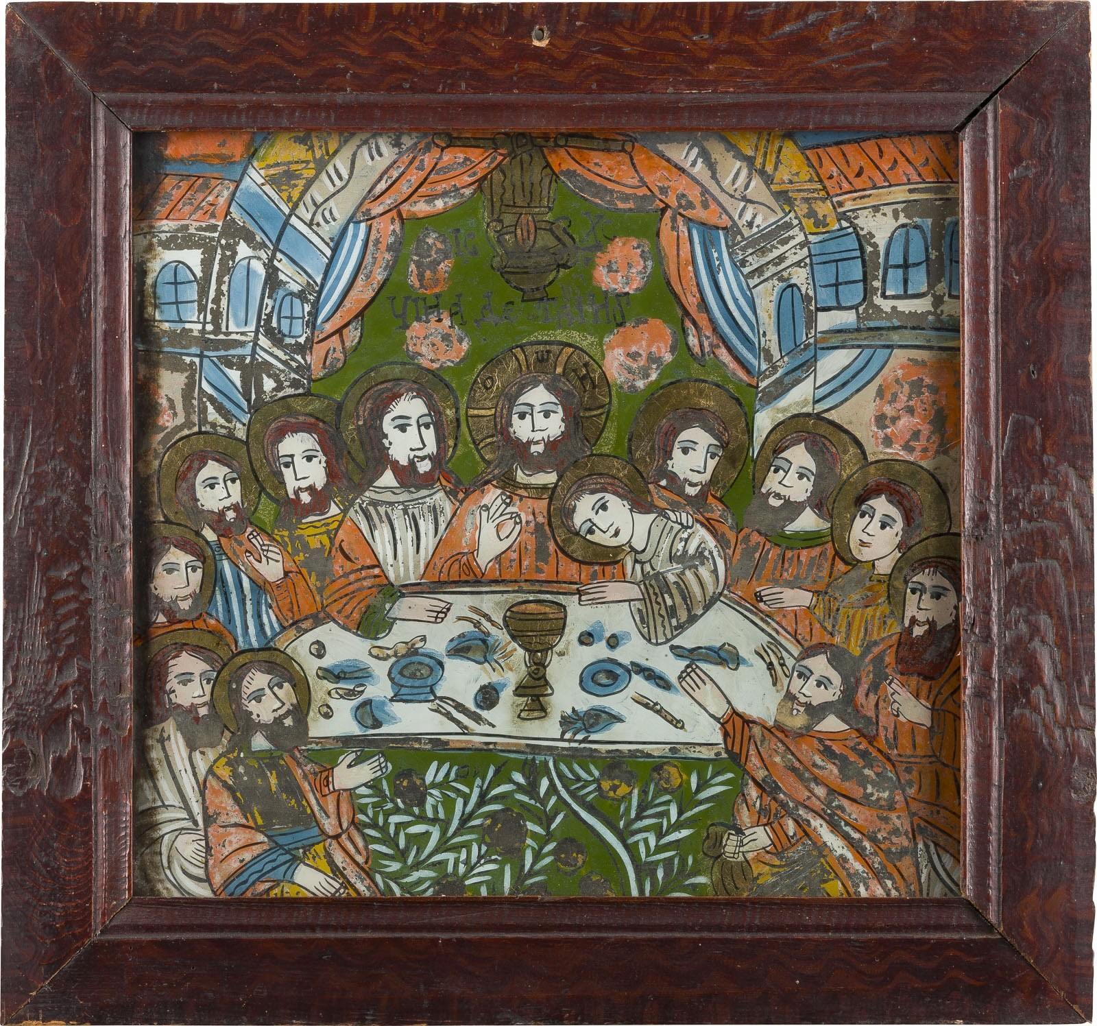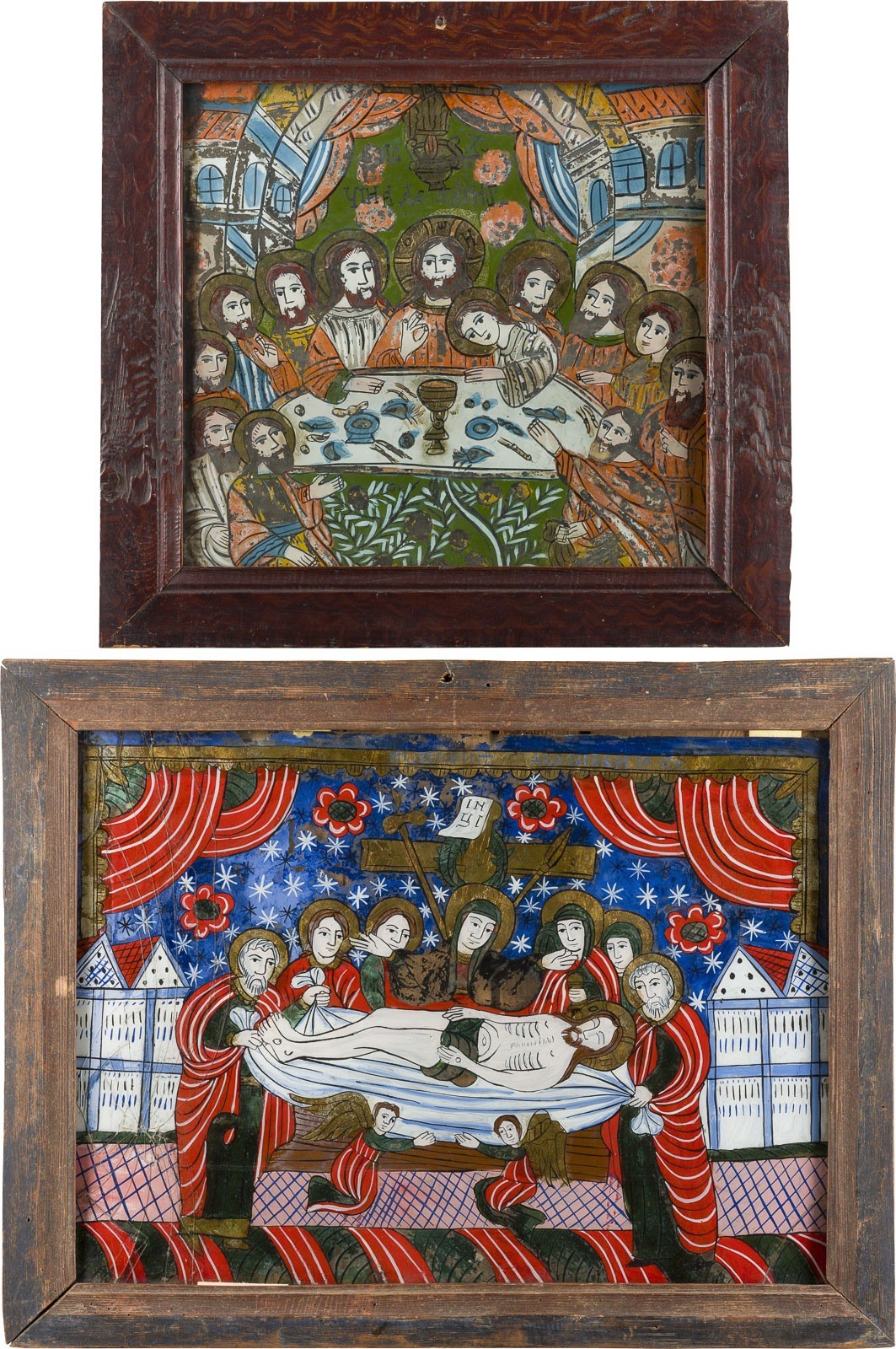 ZWEI GROSSFORMATIGE HINTERGLAS-IKONEN: LETZTES ABENDMAHL SOWIE BEWEINUNG CHRISTI