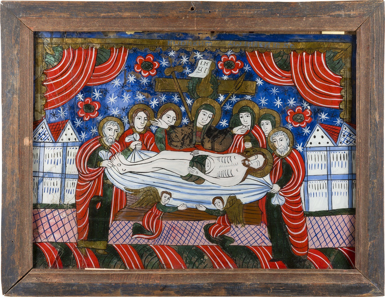 Polychrome Malerei hinter Glas, partielle Vergoldung. 46,8 x 50,2 cm/53 x 68,5 cm. Eine Ikone part. besch., Substanzverluste.