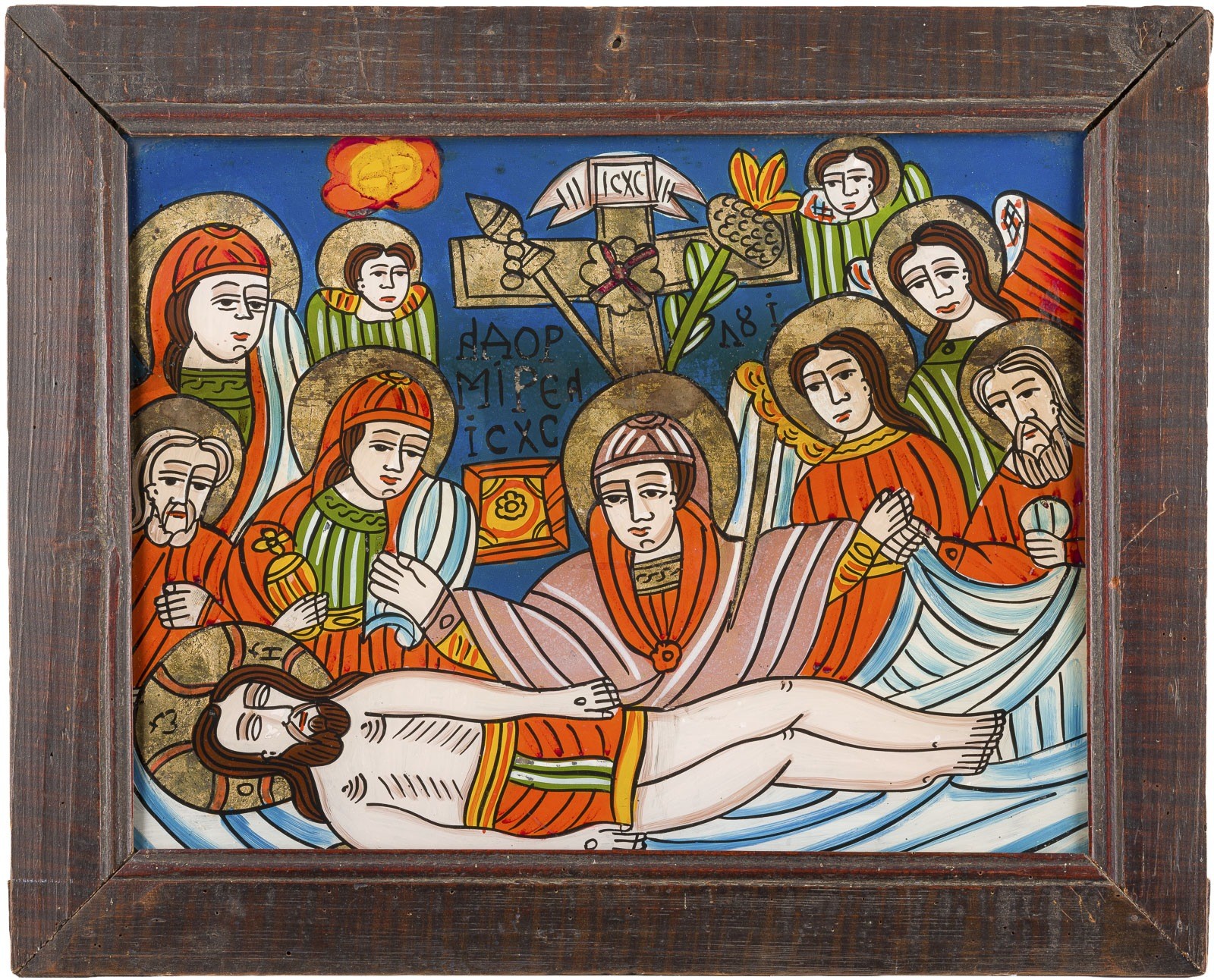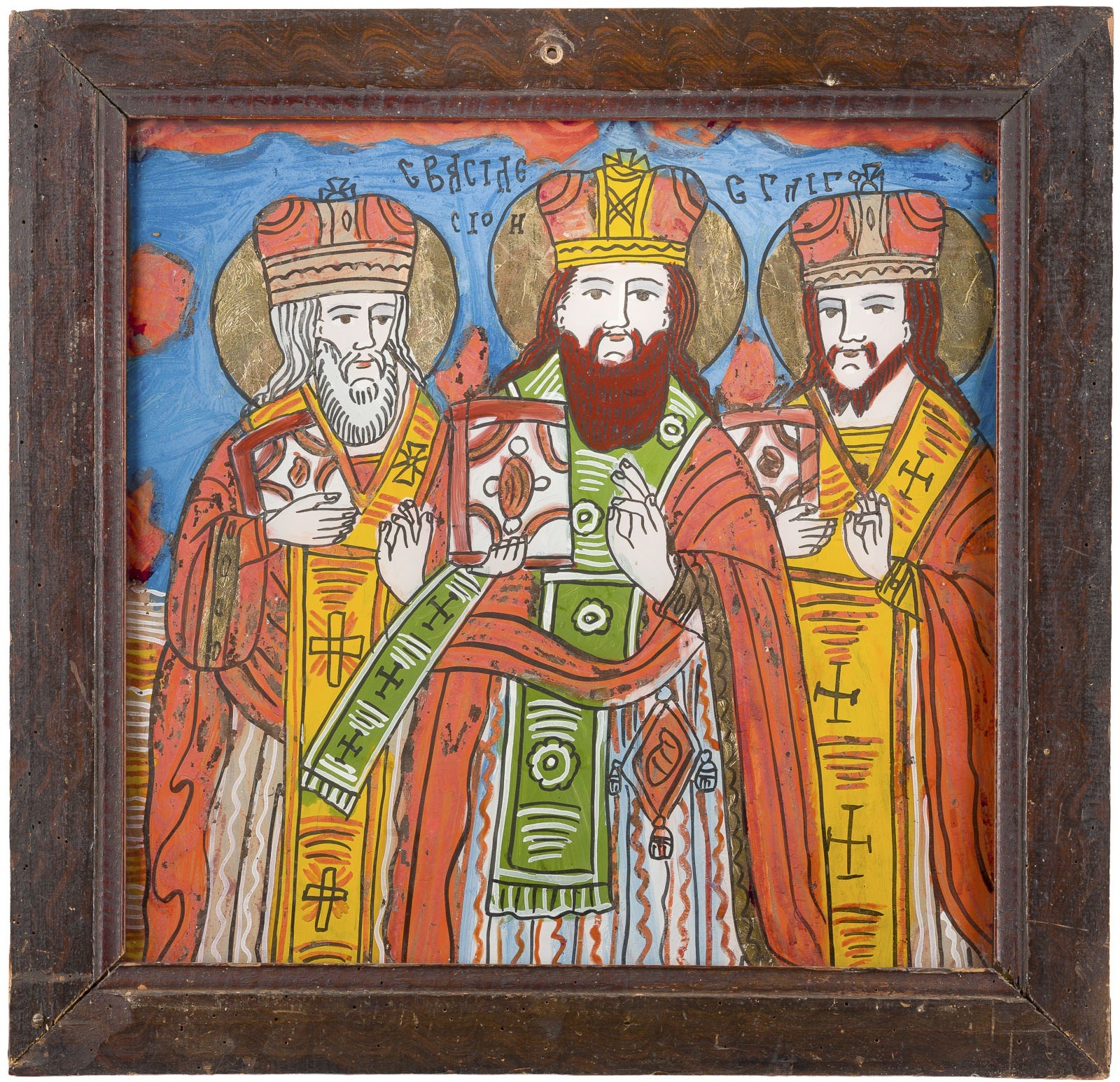 ZWEI HINTERGLAS-IKONEN: BEWEINUNG CHRISTI SOWIE DREI HIERARCHEN