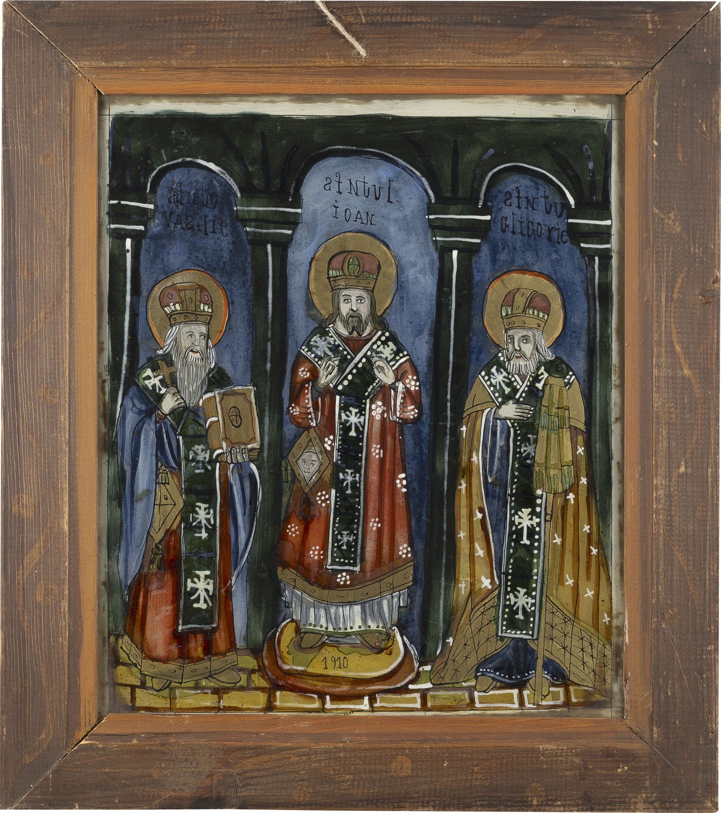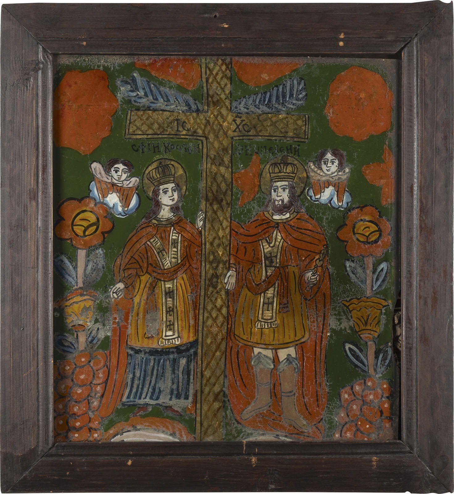 ZWEI HINTERGLAS-IKONEN: HEILIGE KONSTANTIN UND HELENA SOWIE HEILIGE HIERARCHEN BASILIOS, JOHANNES UND GREGORIOS