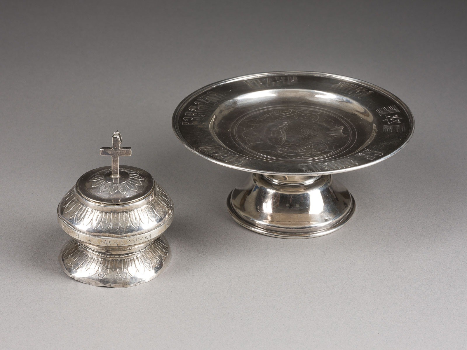 DISKOS MIT DER ANBETUNG CHRISTI UND LITURGISCHE DOSE MIT KREUZ