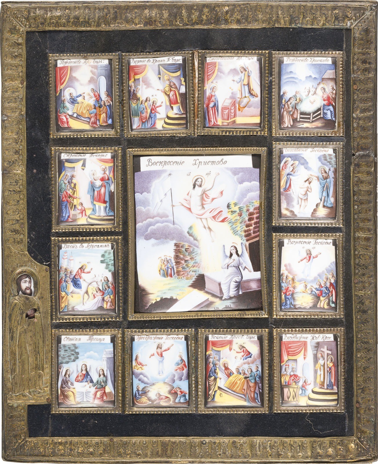Polychrome Malerei auf Metall, in Holztafel eingesetzt, Messingbasma. 35,5 x 28,8 cm. Links Randheiliger Sergej von Radonesch.