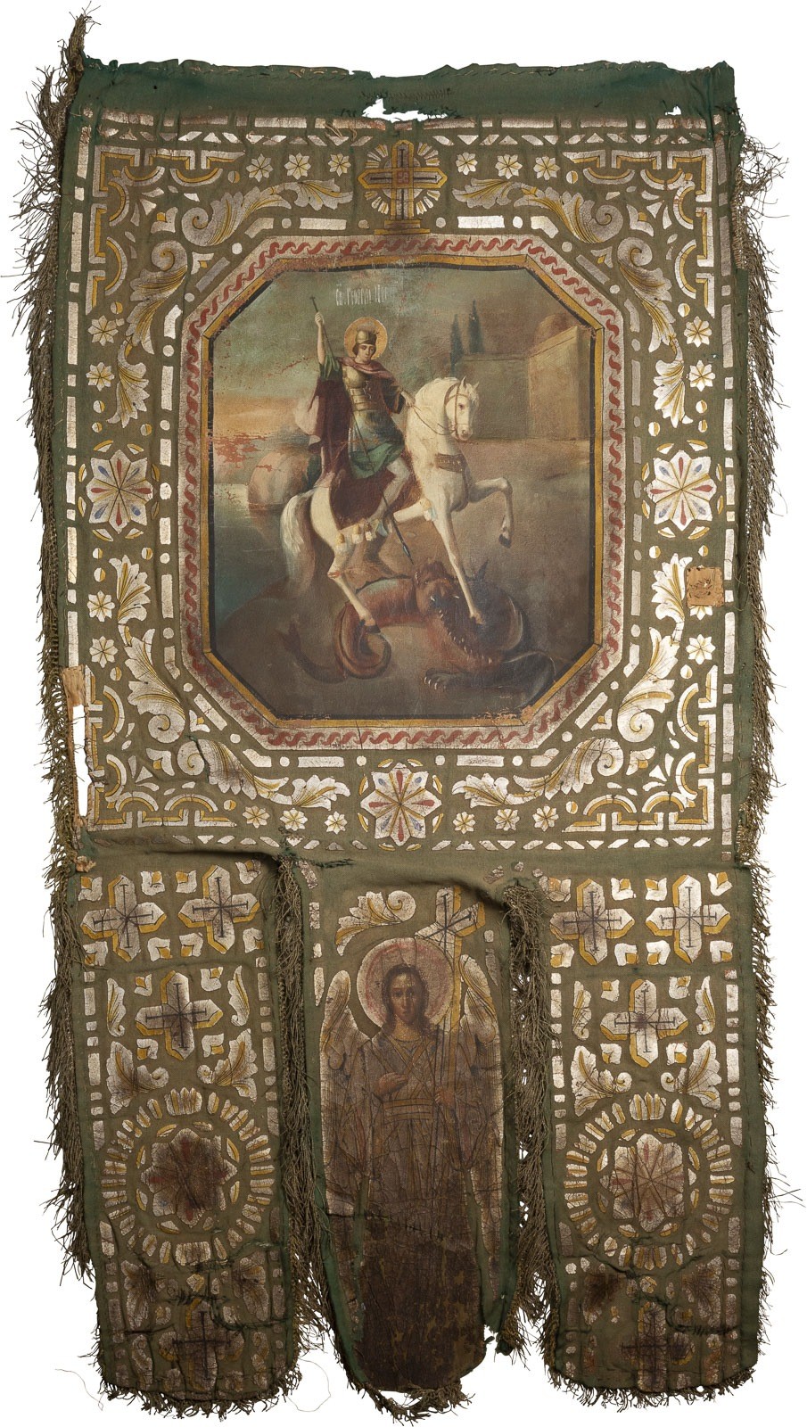 PROZESSIONS-FLAGGE MIT DER AUFERSTEHUNG CHRISTI UND DEM HEILIGEN GEORG DEM DRACHENTÖTER