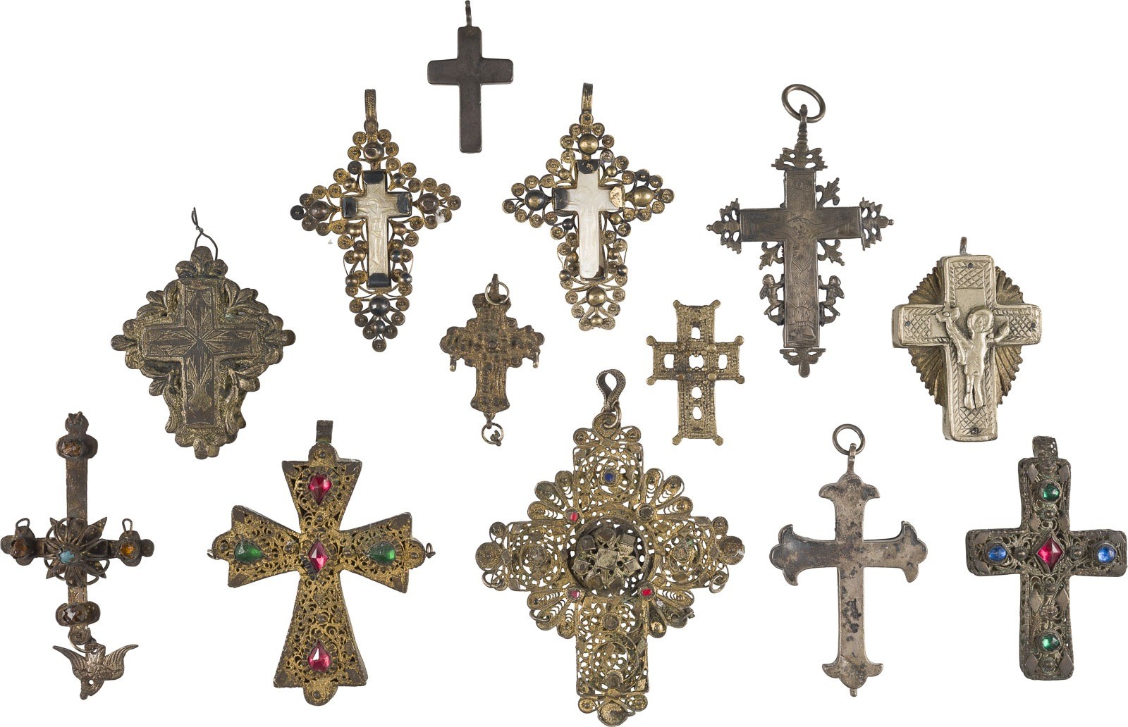Metall, gegossen, Scheinsteinbesatz, Perlmutt. L. 4,5-9,8 cm. Teils min. besch.