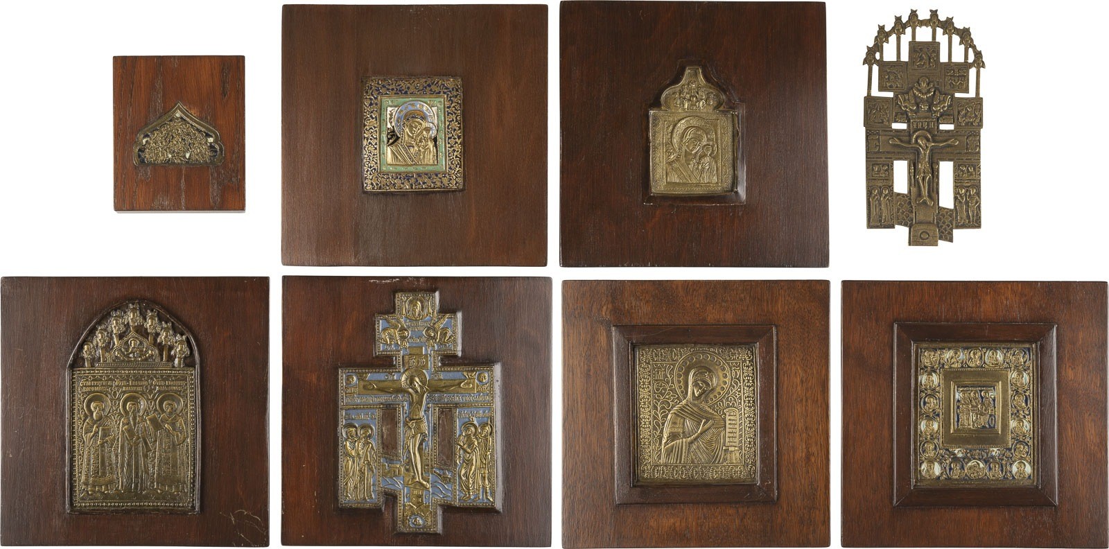 SAMMLUNG VON ACHT BRONZE-IKONEN: KRUZIFIXE, DARSTELLUNGEN DER GOTTESMUTTER, AUSGEWÄHLTE HEILIGE SOWIE EIN FRAGMENT