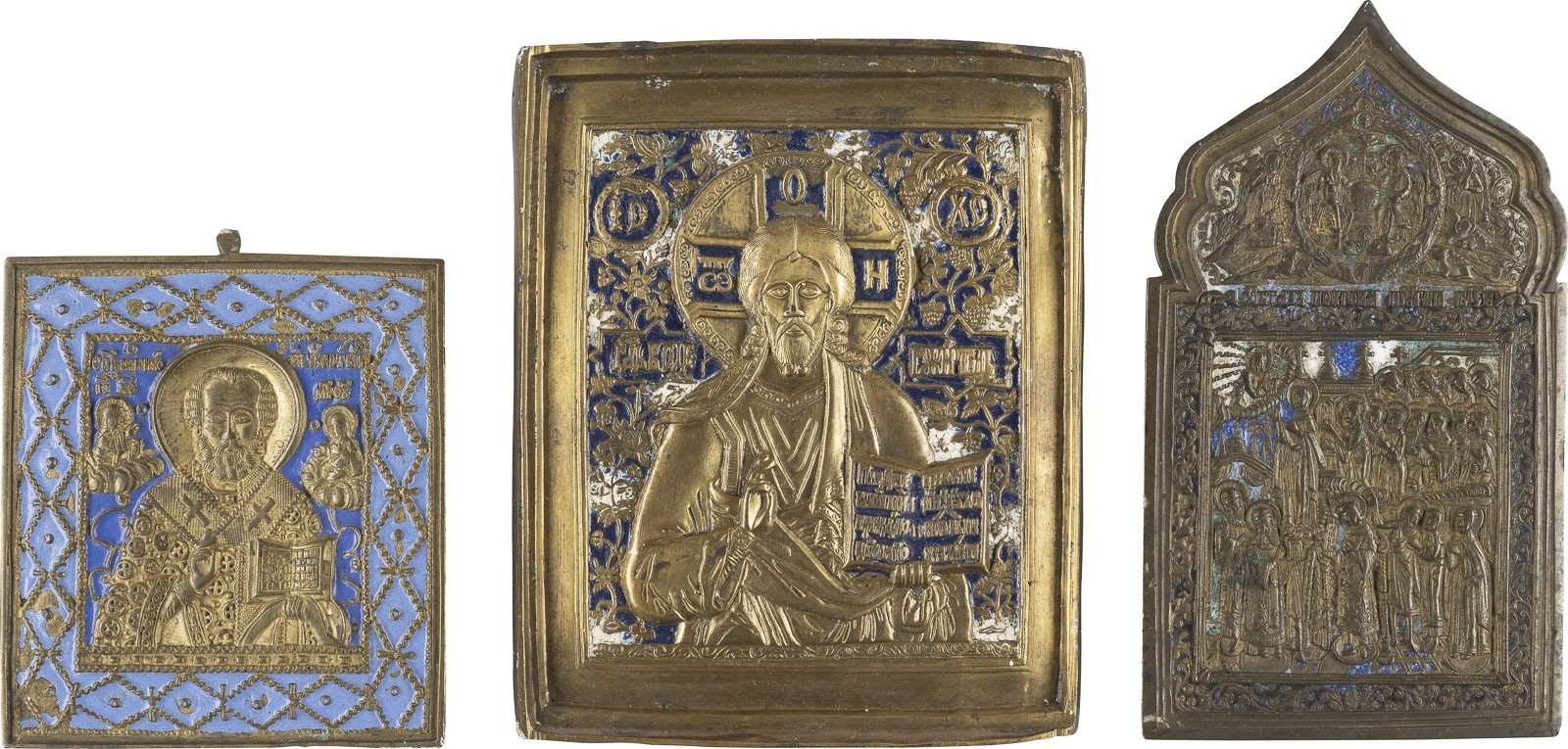 SAMMLUNG VON DREI BRONZE-IKONEN: CHRISTUS PANTOKRATOR, HEILIGER NIKOLAUS VON MYRA SOWIE SCHLEIERWUNDER (POKROW)