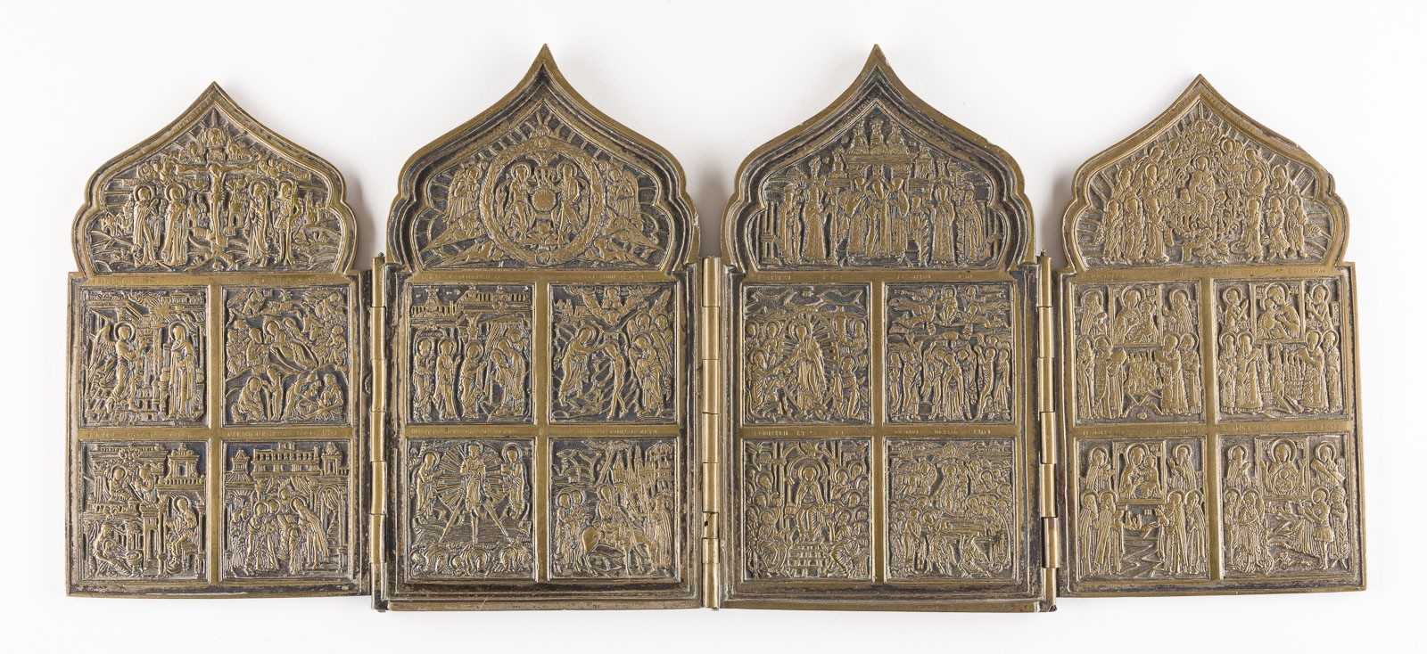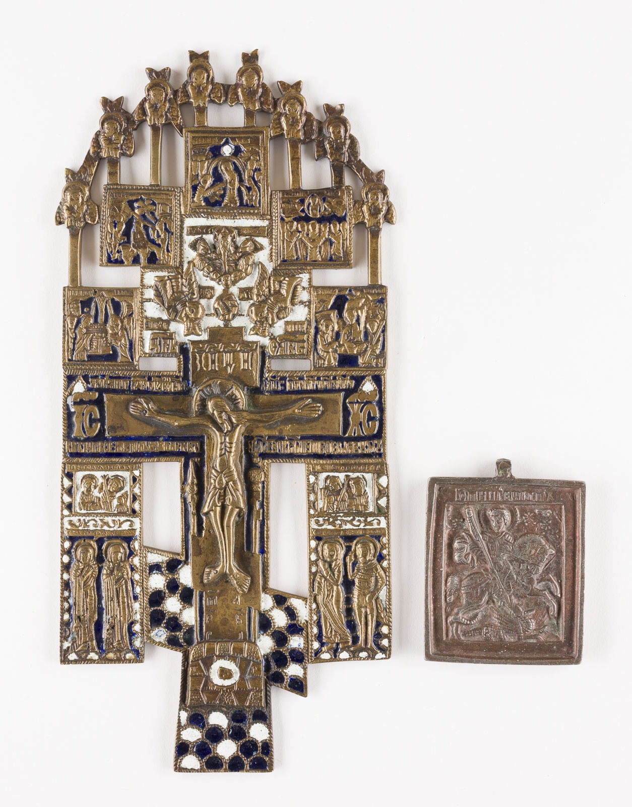 SAMMLUNG VON DREI BRONZE-IKONEN: KRUZIFIX, HEILIGER GEORG DER DRACHENTÖTER SOWIE TETRAPTYCHON MIT FESTTAGEN