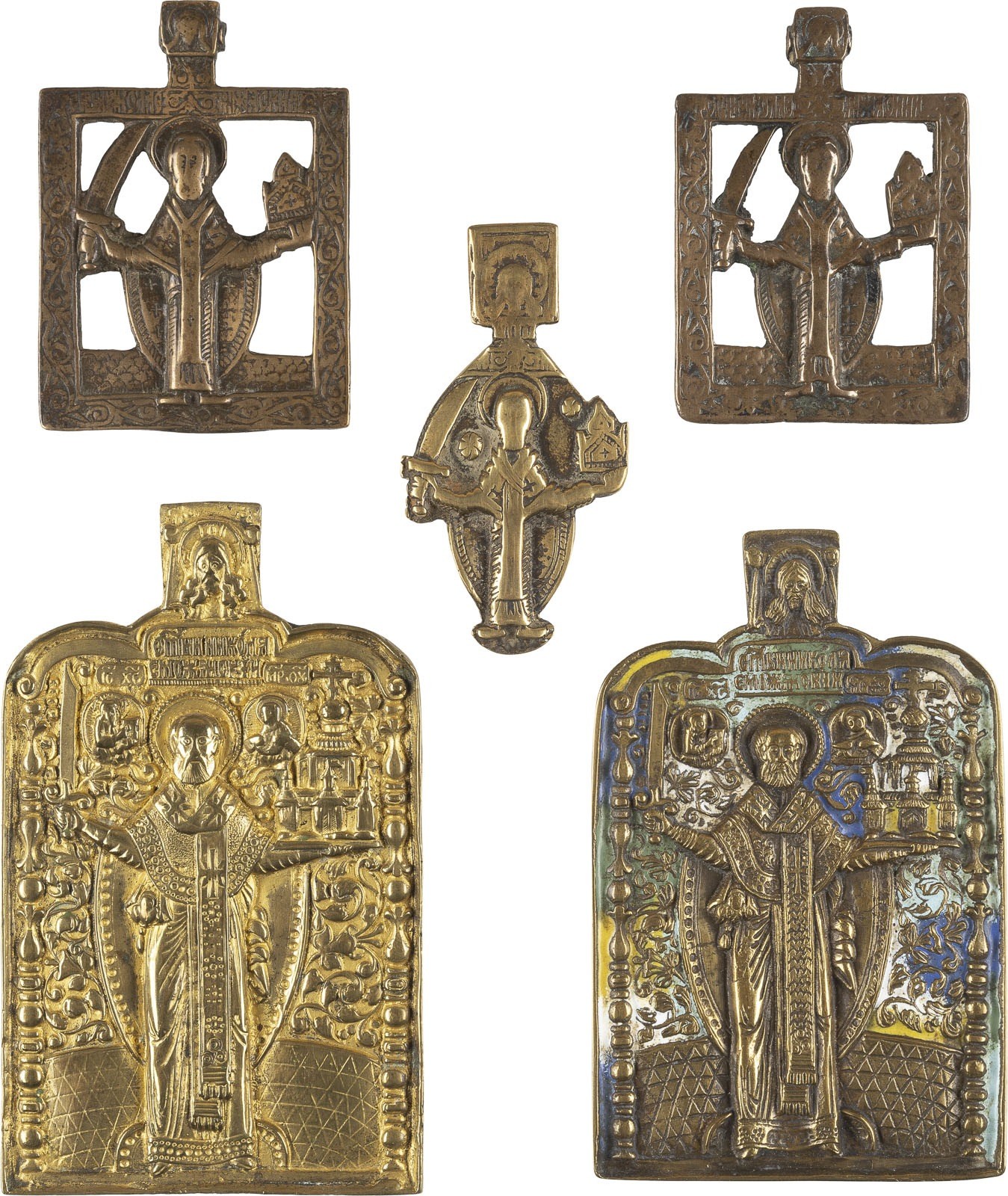 SAMMLUNG VON FÜNF BRONZE-IKONEN MIT DEM HEILIGEN NIKOLAUS VON MOSCHAISK