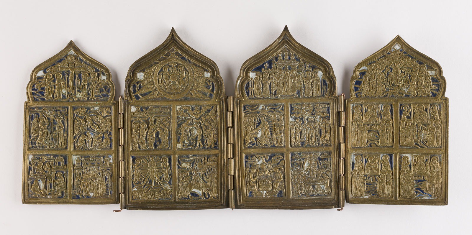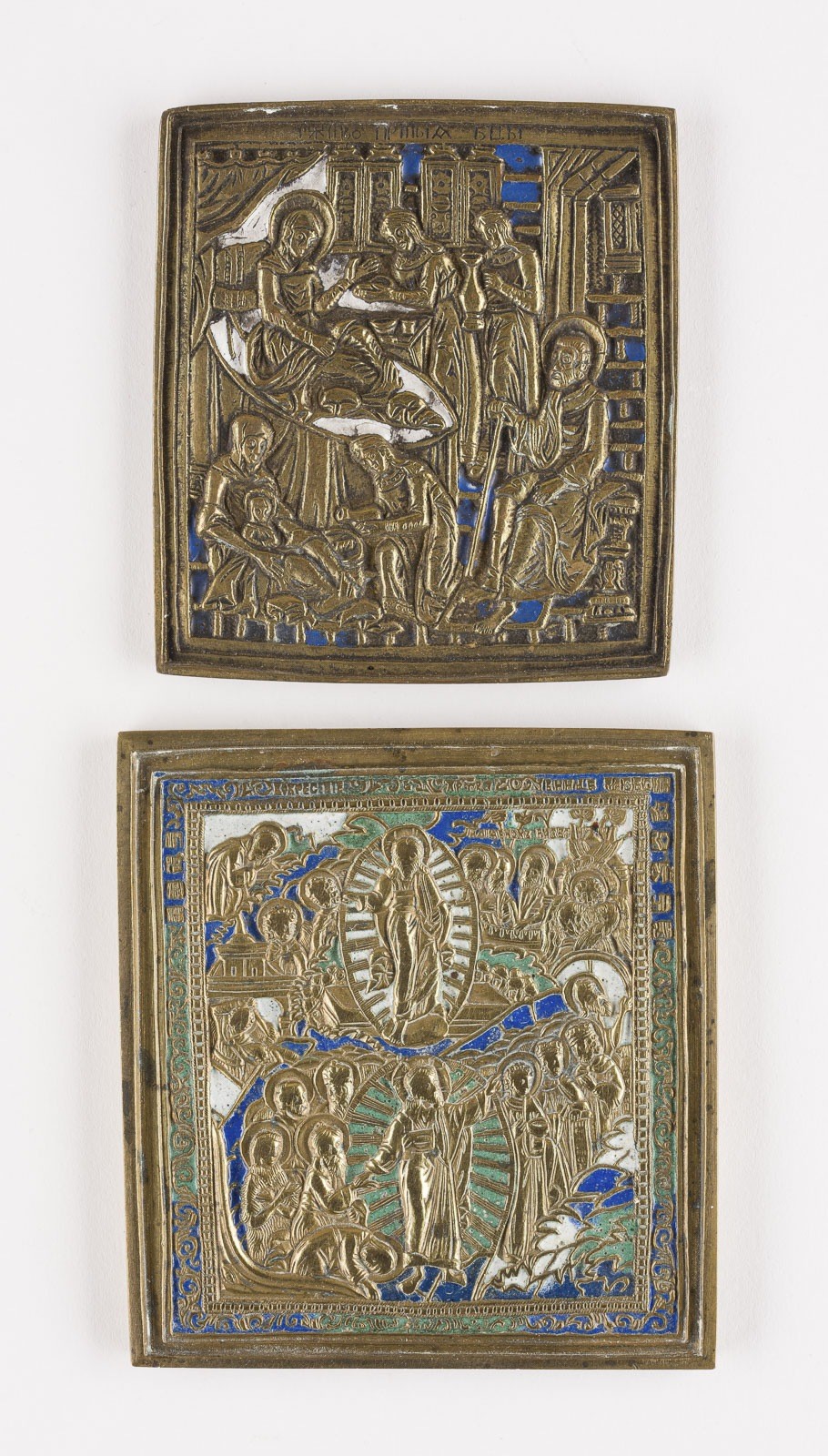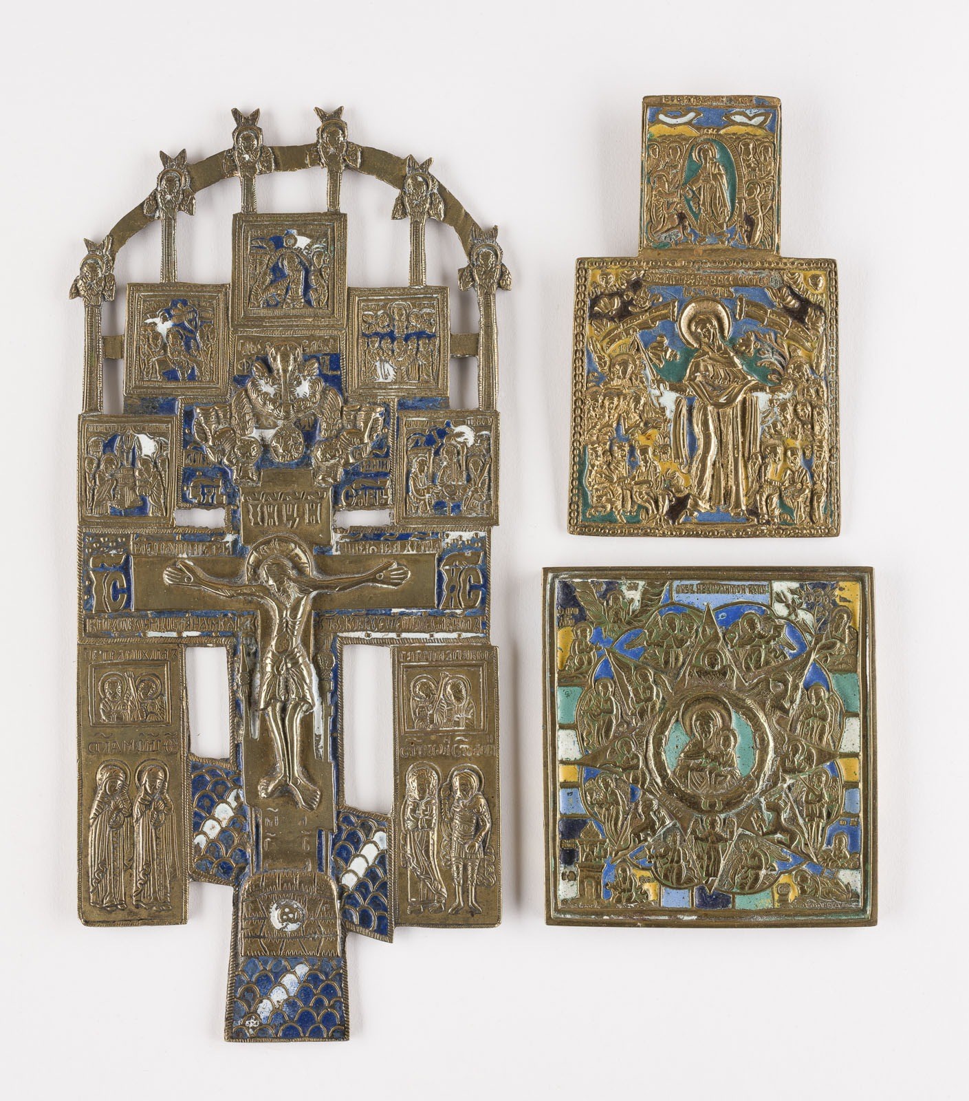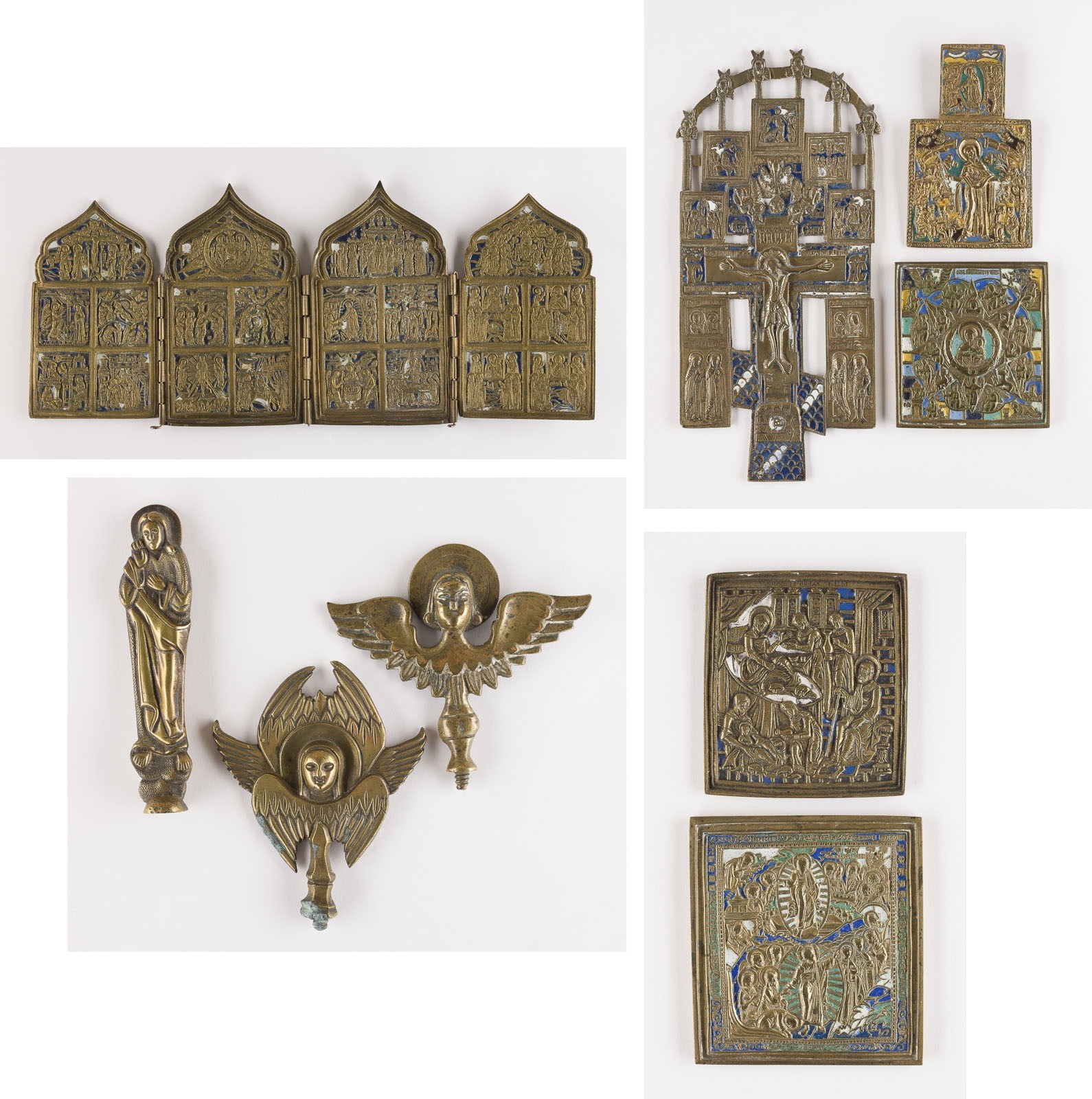 SAMMLUNG VON NEUN BRONZE-IKONEN: KRUZIFIX, DARSTELLUNGEN DER GOTTESMUTTER SOWIE FESTTAGE