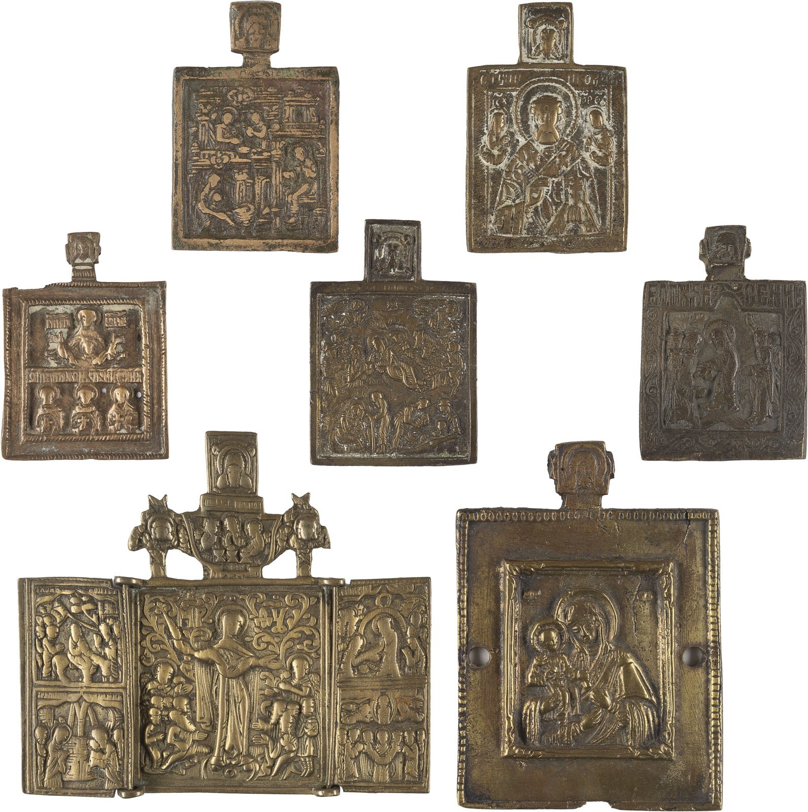 SAMMLUNG VON SIEBEN BRONZE-IKONEN: DARSTELLUNGEN DER GOTTESMUTTER, FESTTAGE SOWIE HEILIGER NIKOLAUS VON MYRA