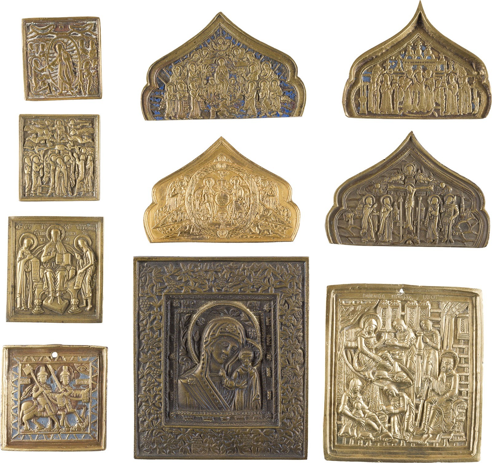 Bronze, reliefiert gegossen, teils in Blau emailliert, teils vergoldet. H. 4,7-11,2 cm. Email best., zwei Ikonen mit Loch.