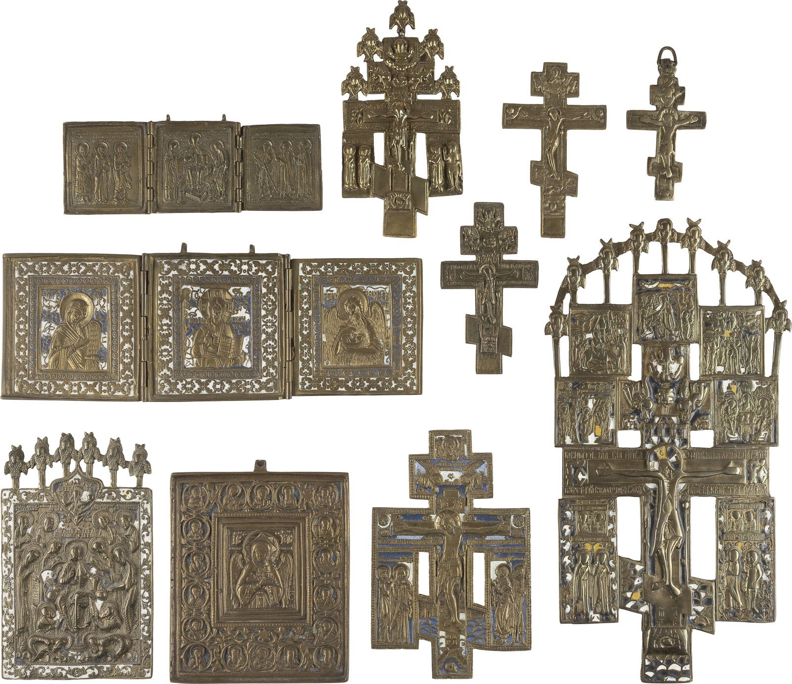SAMMLUNG VON ZEHN BRONZE-IKONEN: KRUZIFIXE, DEESIS SOWIE CHRISTUS, DAS GÜTIGE SCHWEIGEN