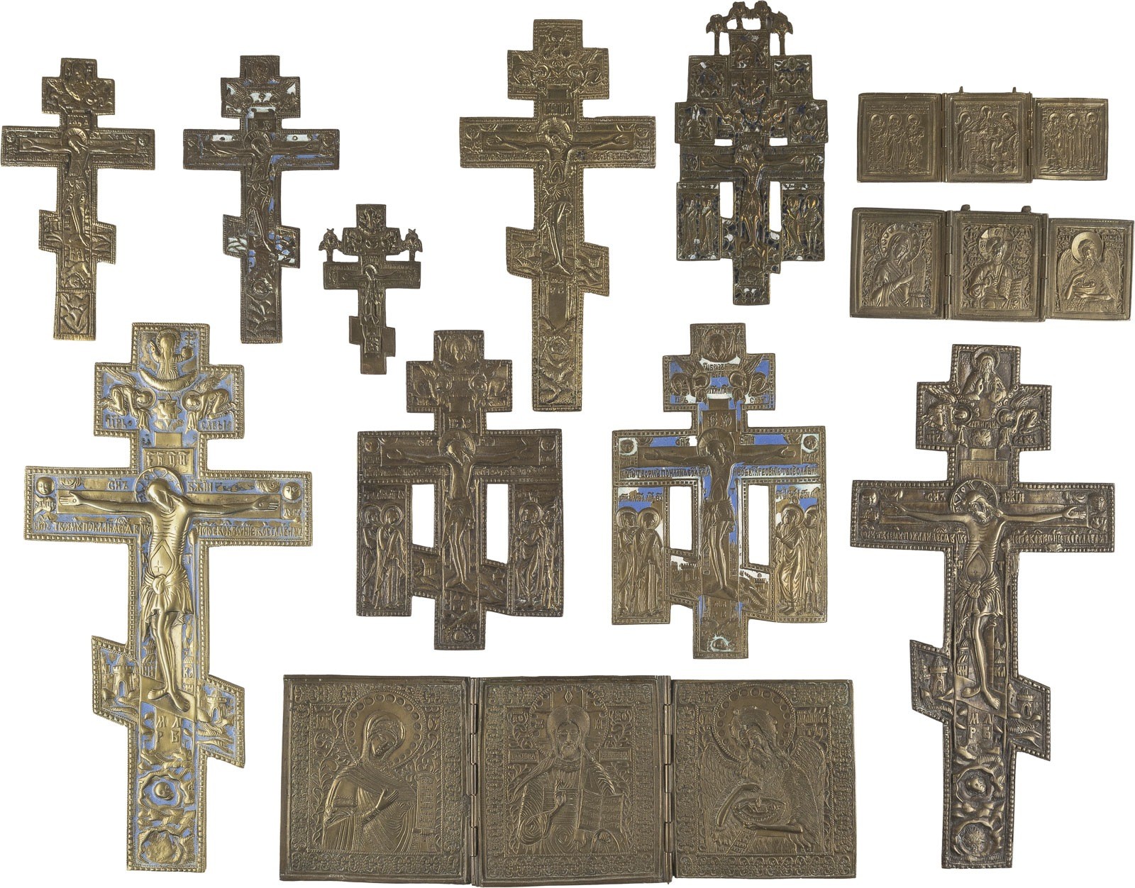 SAMMLUNG VON ZWÖLF BRONZE-IKONEN: KRUZIFIXE SOWIE DEESIS