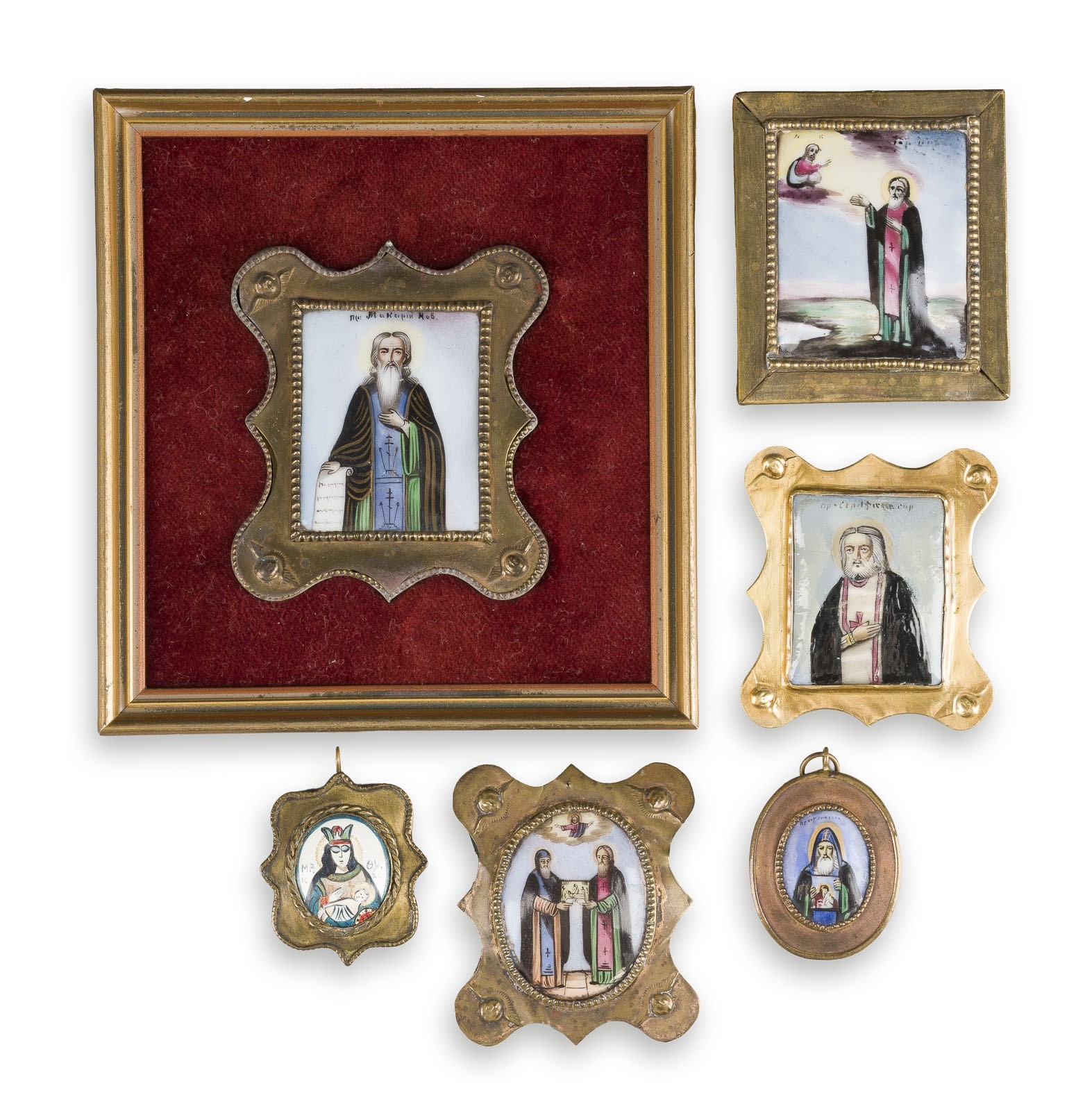 Polychrome Emailmalerei auf Metall. Messingrahmung. H. 3,8-7,2 cm. Teils besch. und rest.