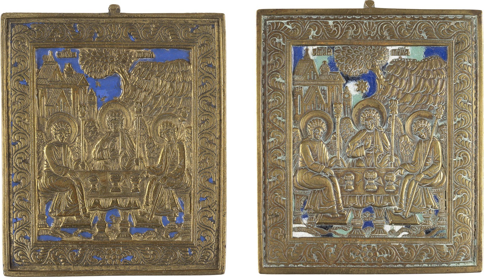 ZWEI BRONZE-IKONEN MIT DER ALTTESTAMENTLICHEN DREIFALTIGKEIT: DARUNTER EINE SIGNIERTE IKONE